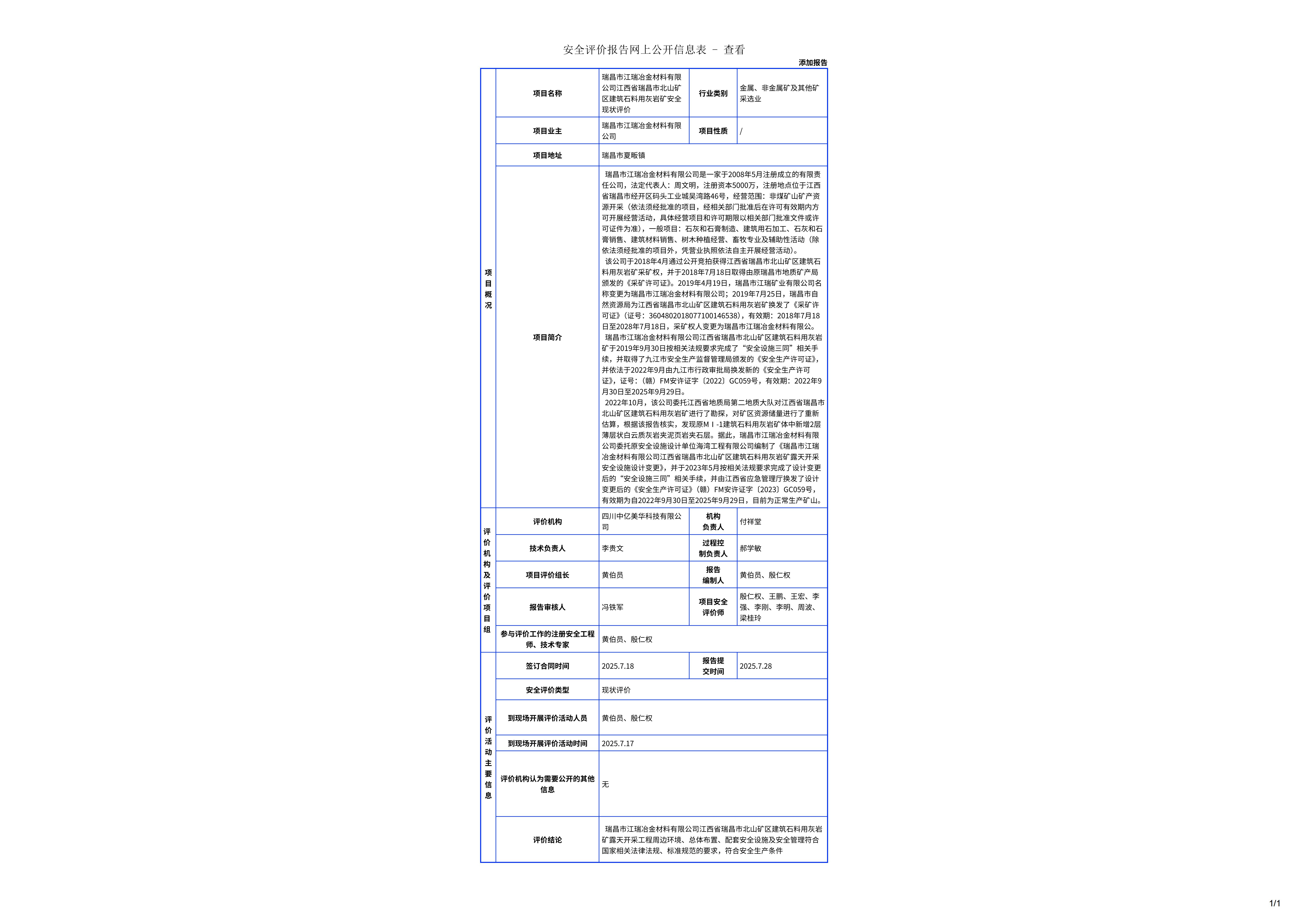 瑞昌市江瑞冶金材料有限公司江西省瑞昌市北山矿区建筑石料用灰岩矿安全现状评价