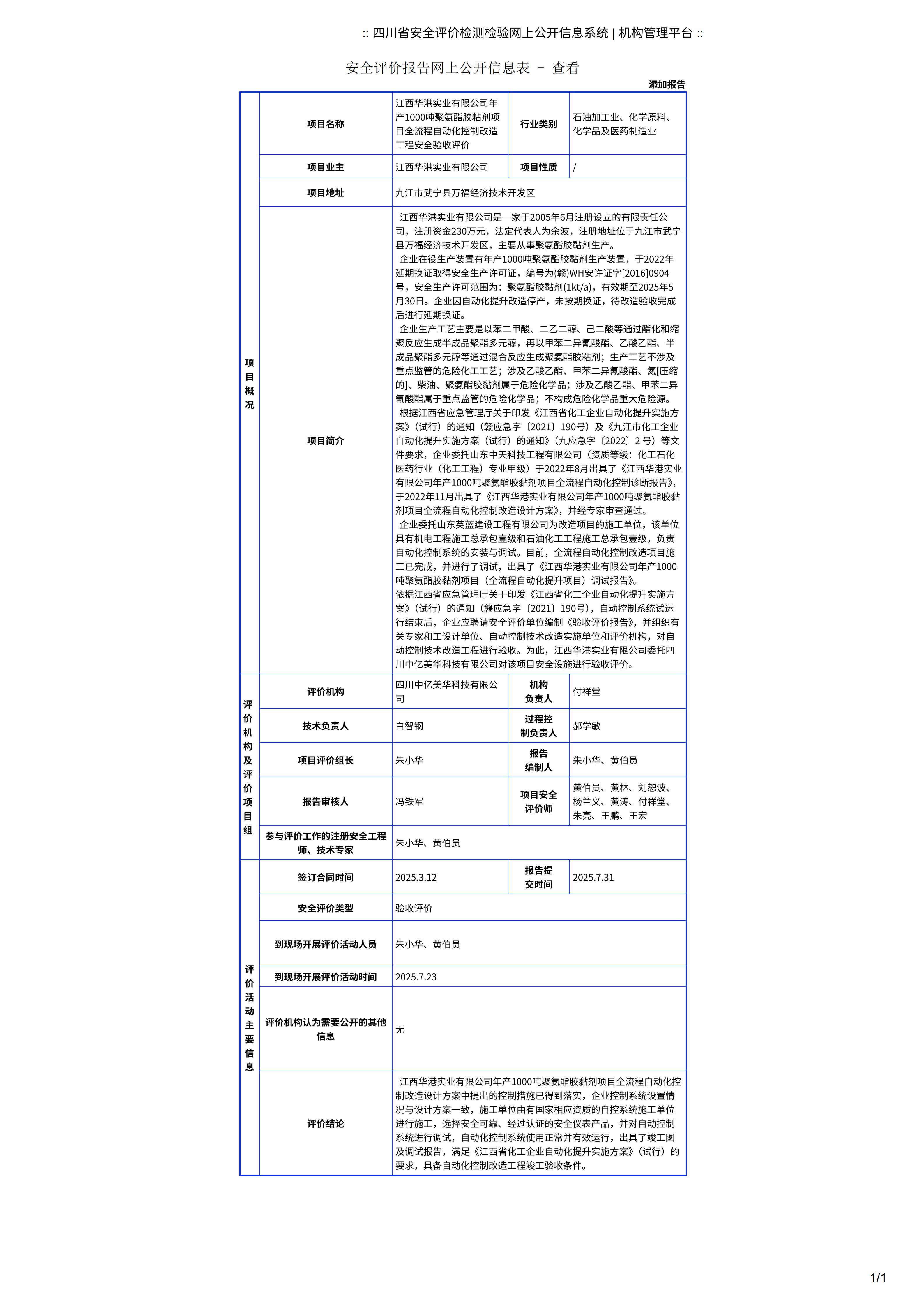 江西华港实业有限公司年产1000吨聚氨酯胶粘剂项目全流程自动化控制改造工程安全验收评价