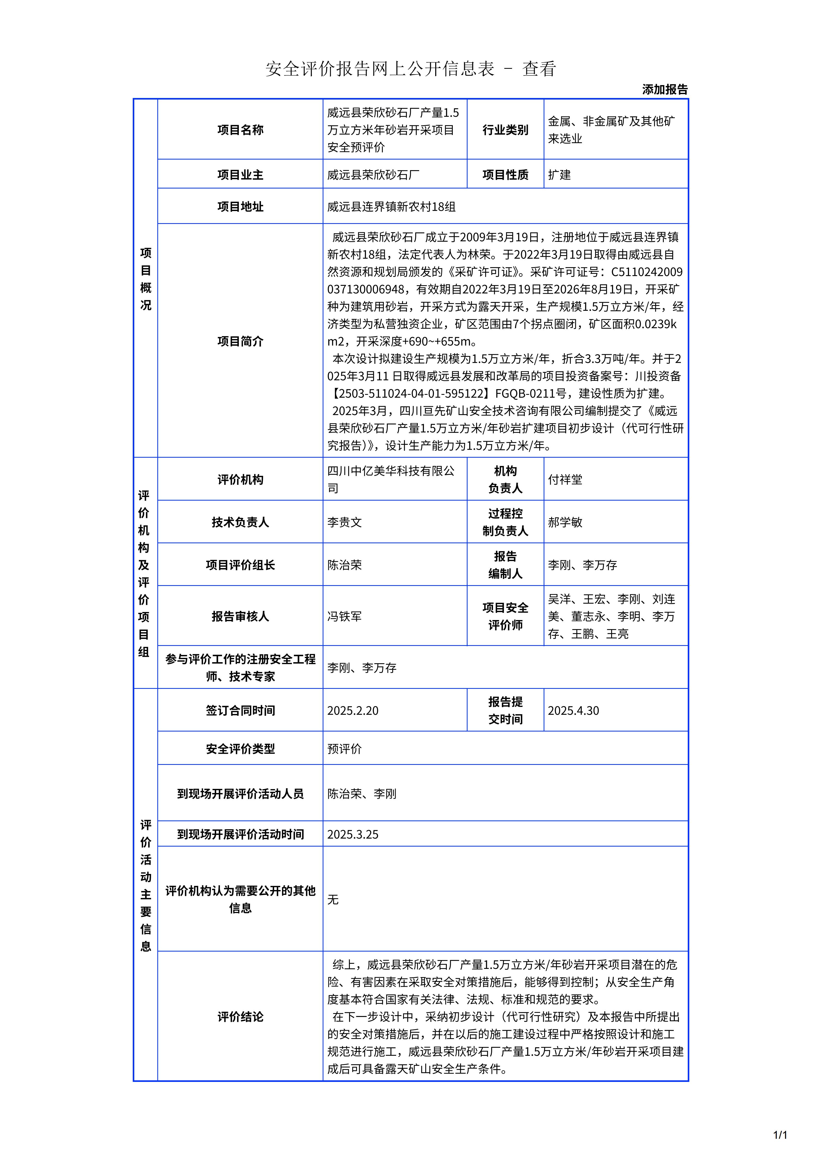 威远县荣欣砂石厂产量1.5万立方米年砂岩开采项目安全预评价