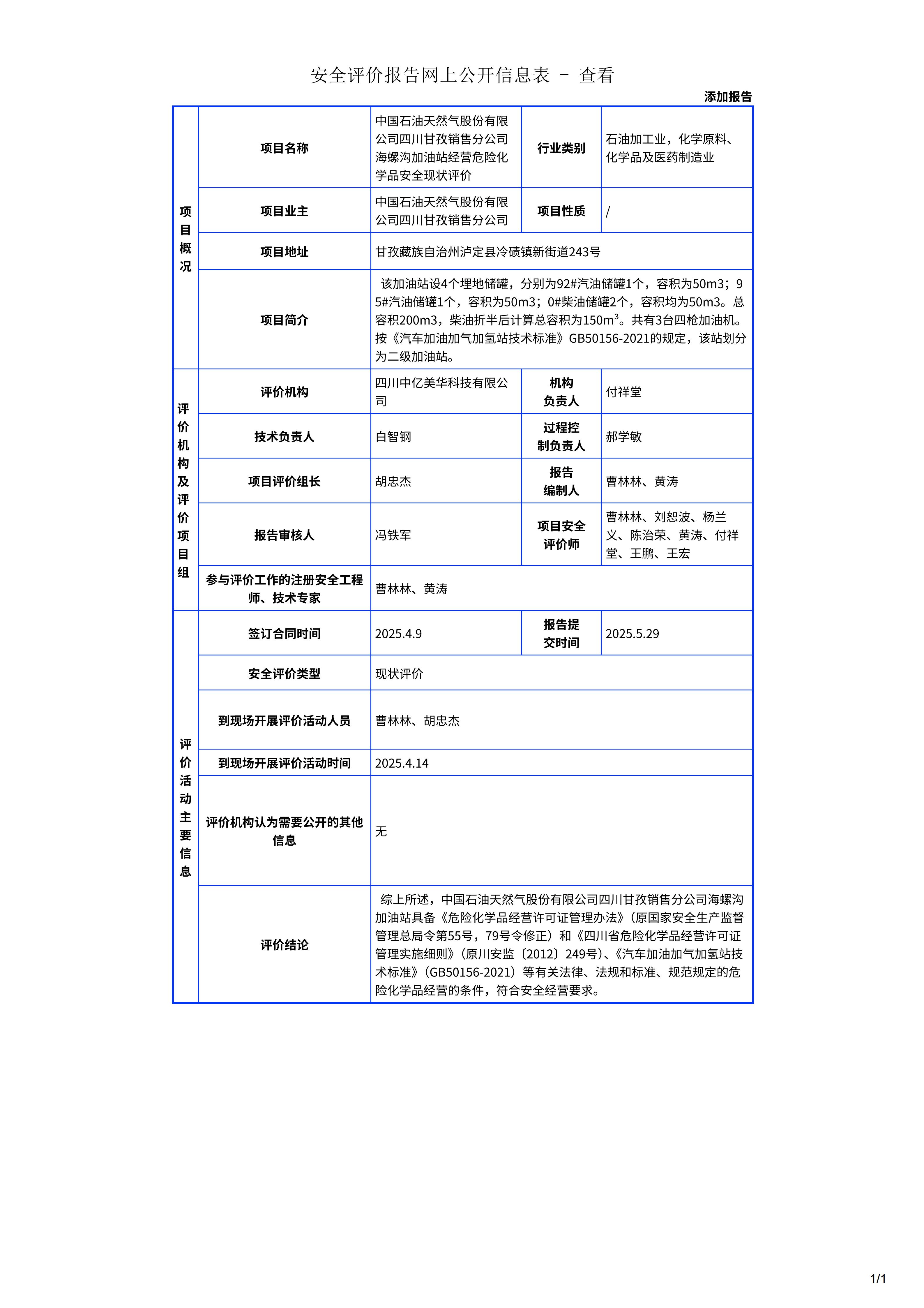 中国石油天然气股份有限公司四川甘孜销售分公司海螺沟加油站经营危险化学品安全现状评价