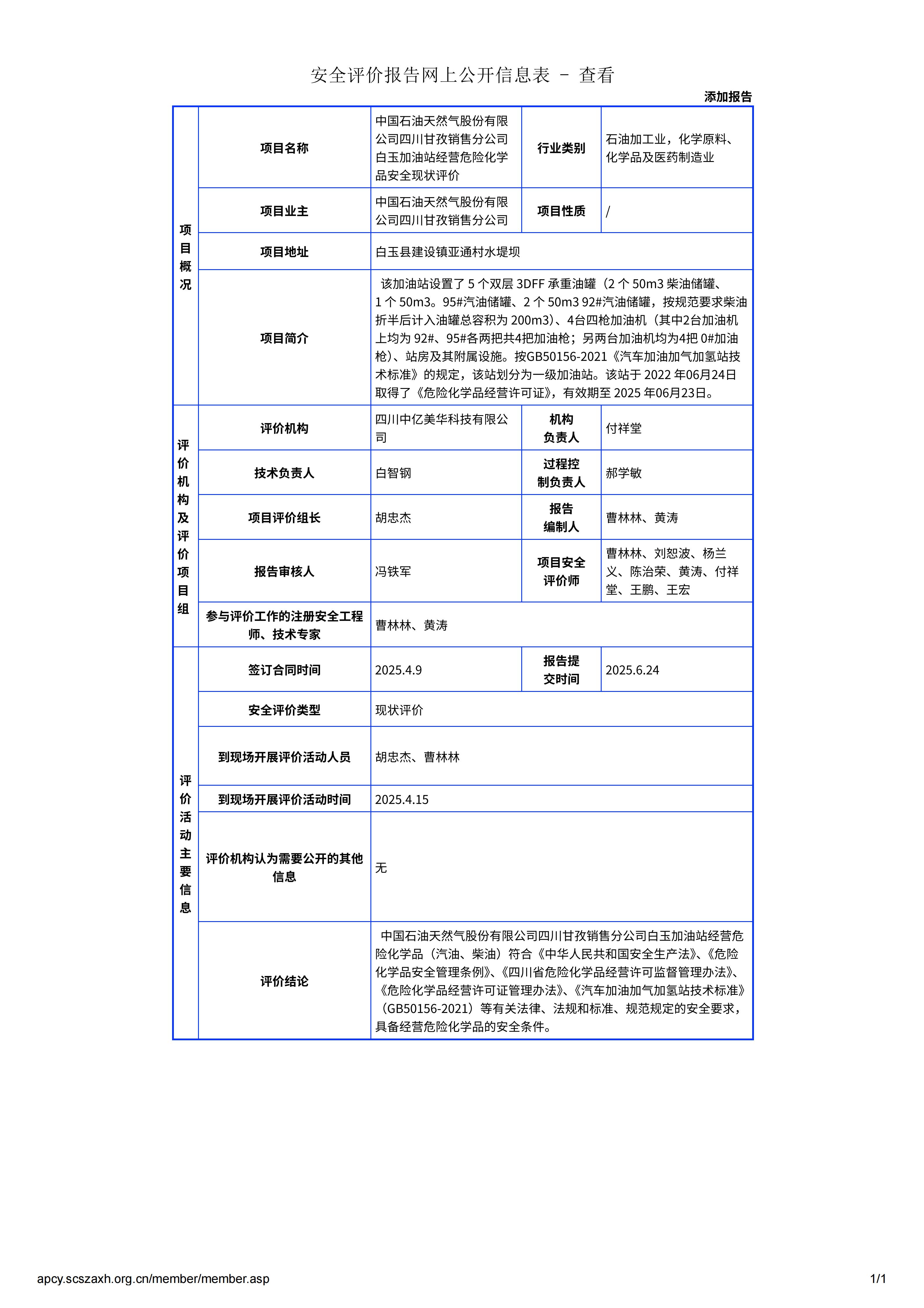 中国石油天然气股份有限公司四川甘孜销售分公司白玉加油站经营危险化学品安全现状评价