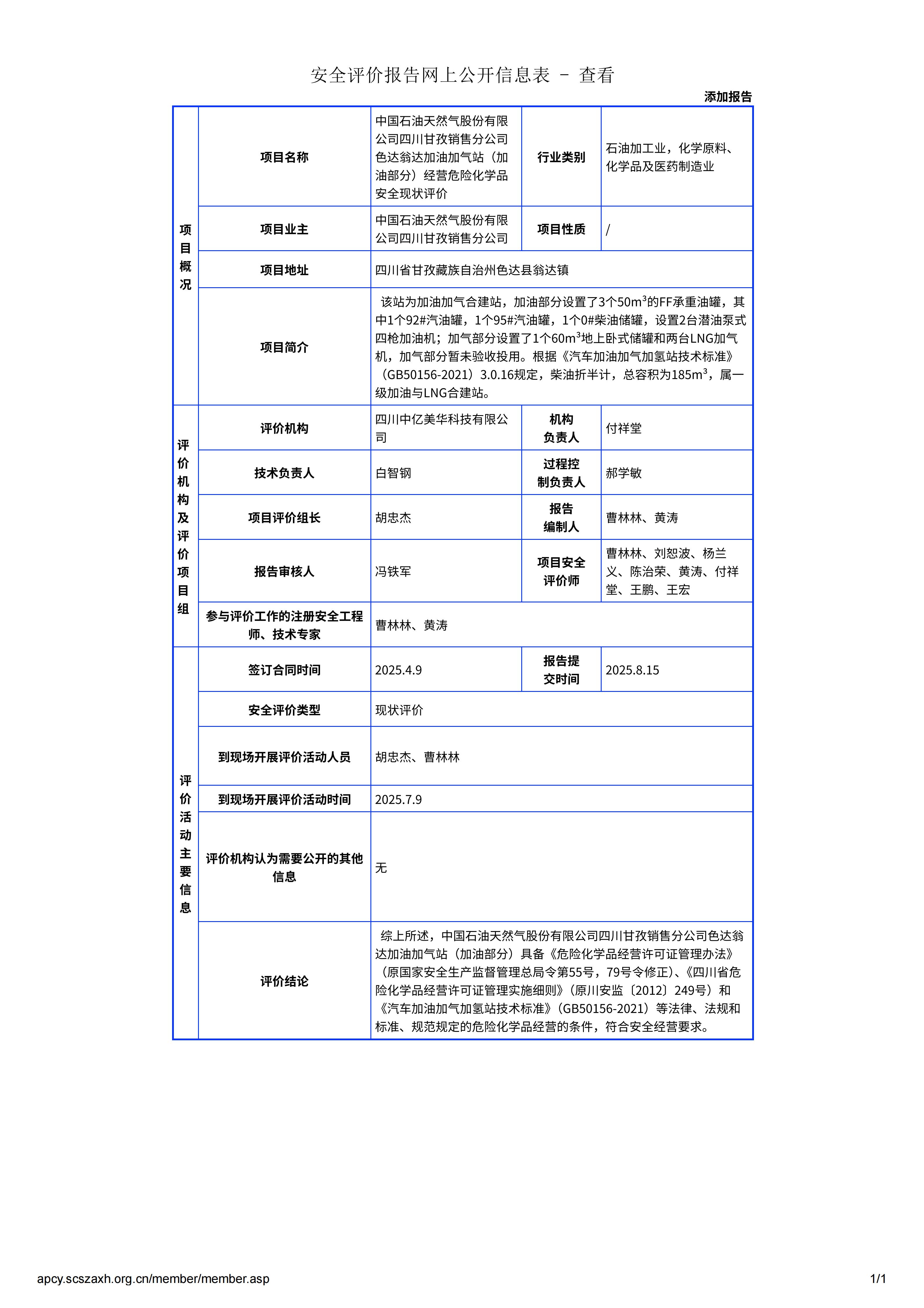 中国石油天然气股份有限公司四川甘孜销售分公司色达翁达加油加气站(加油部分)经营危险化学品安全现状评价