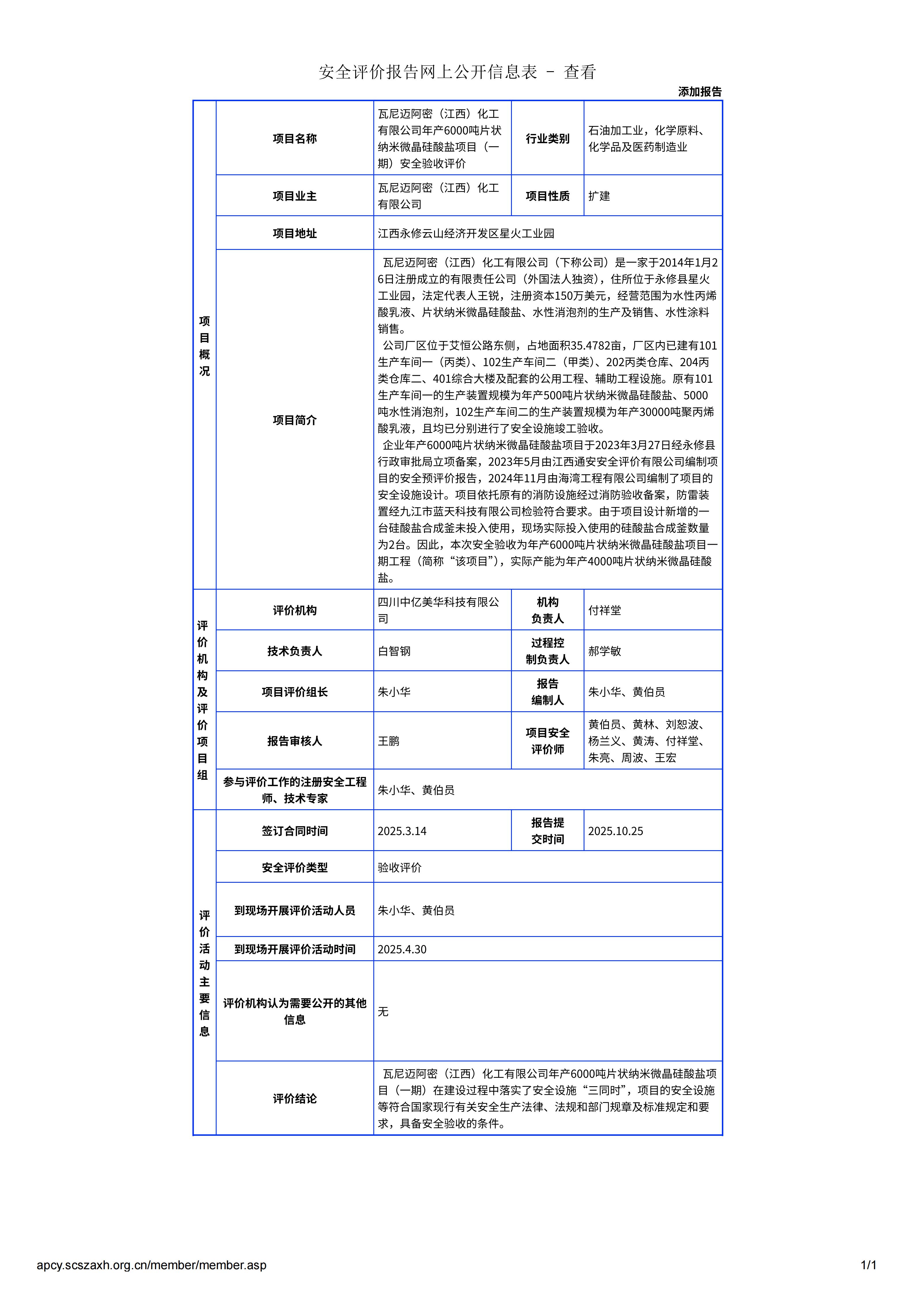 瓦尼迈阿密(江西)化工有限公司年产6000吨片状纳米微晶硅酸盐项目(一期)安全验收评价