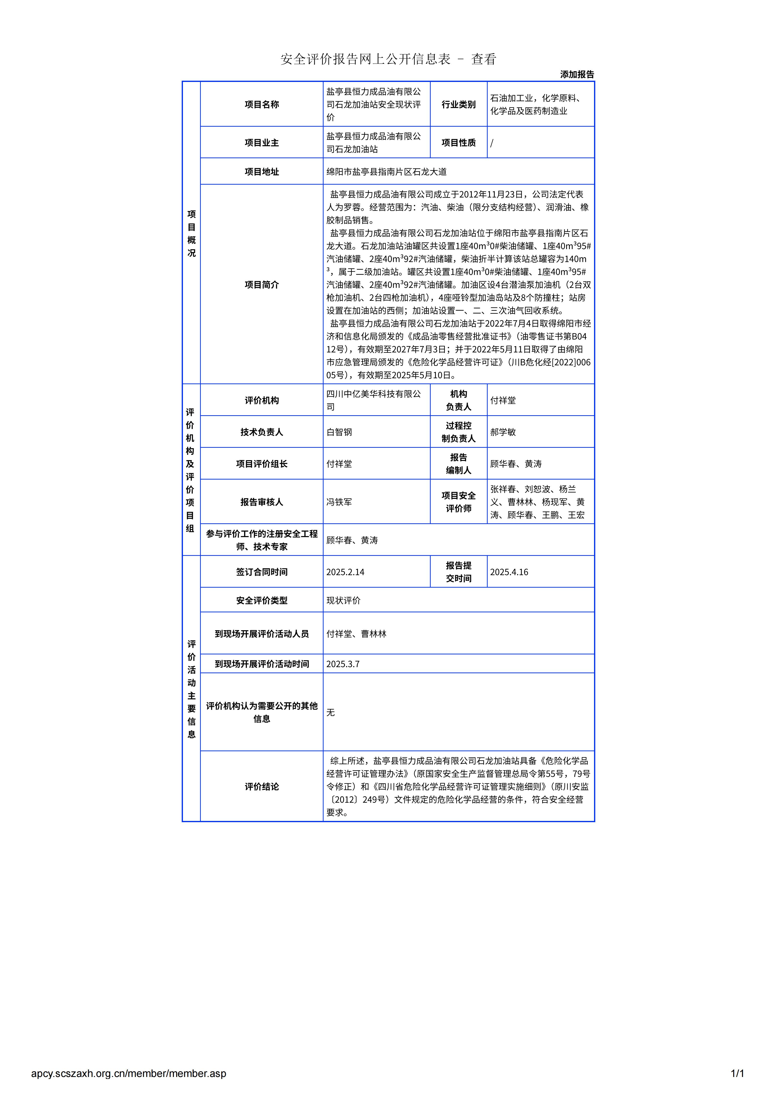 盐亭县恒力成品油有限公司石龙加油站安全现状评价