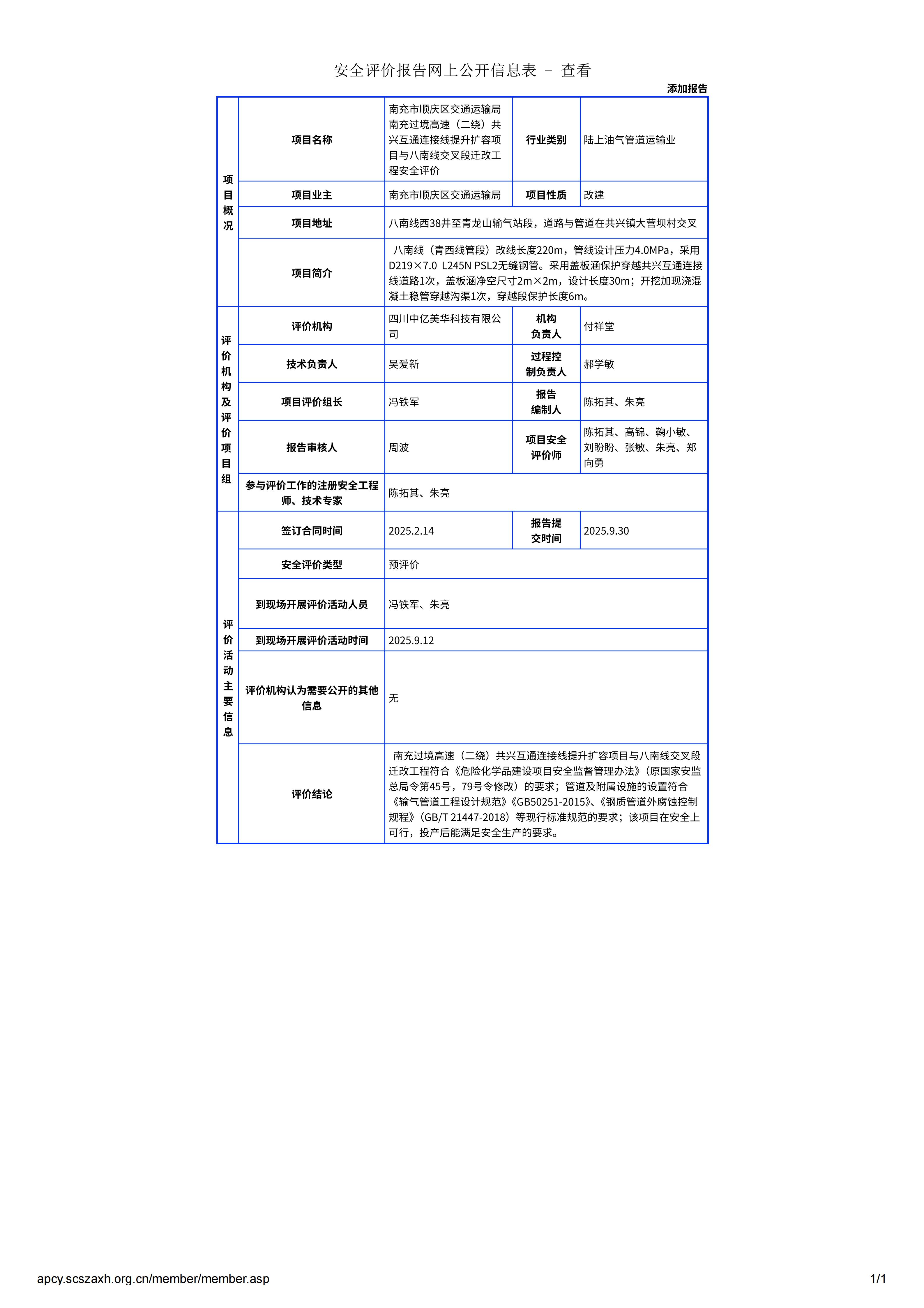 南充市顺庆区交通运输局南充过境高速(二绕)共兴互通连接线提升扩容项目与八南线交叉段迁改工程安全评价