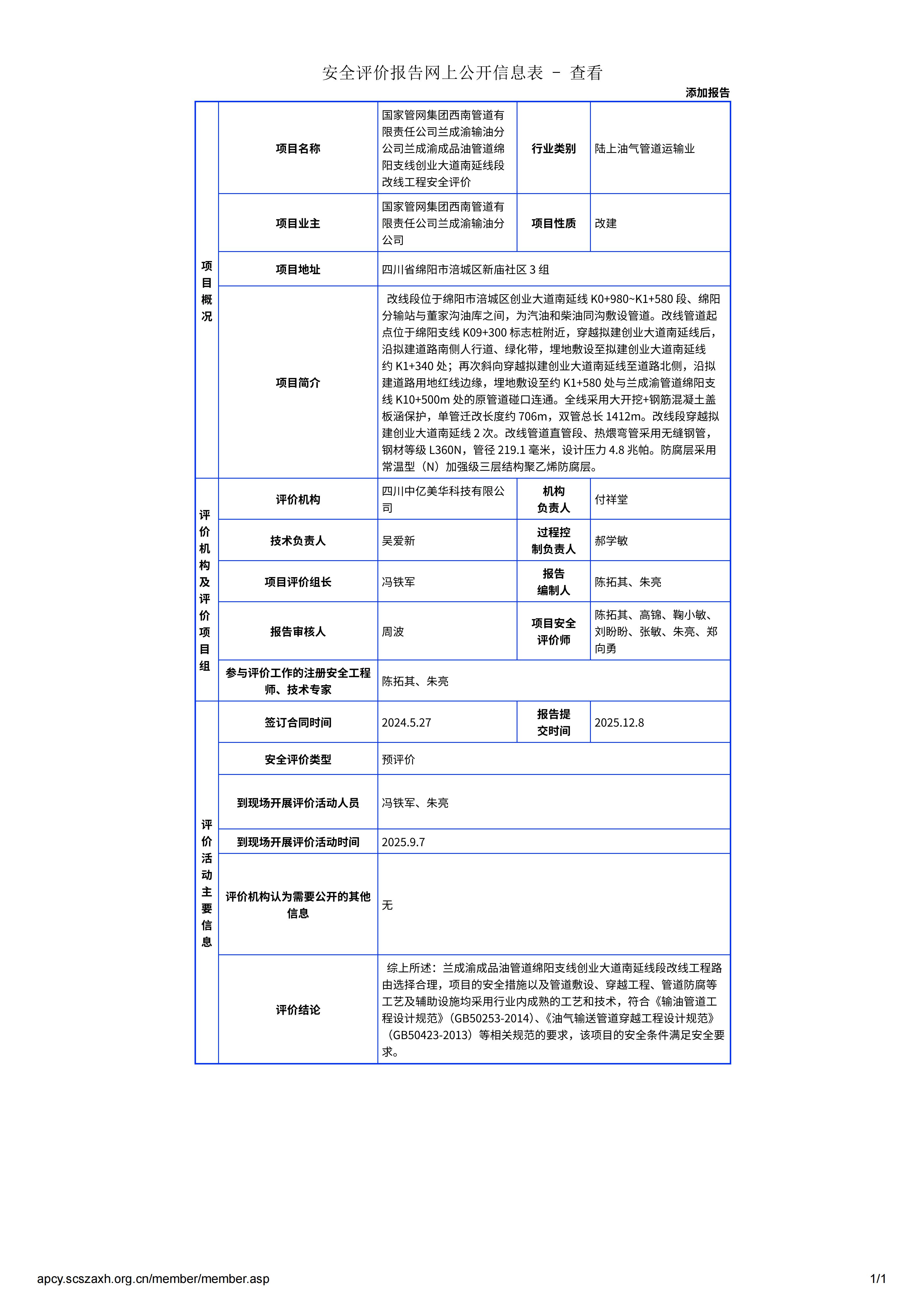国家管网集团西南管道有限责任公司兰成渝输油分公司兰成渝成品油管道绵阳支线创业大道南延线段改线工程安全评价