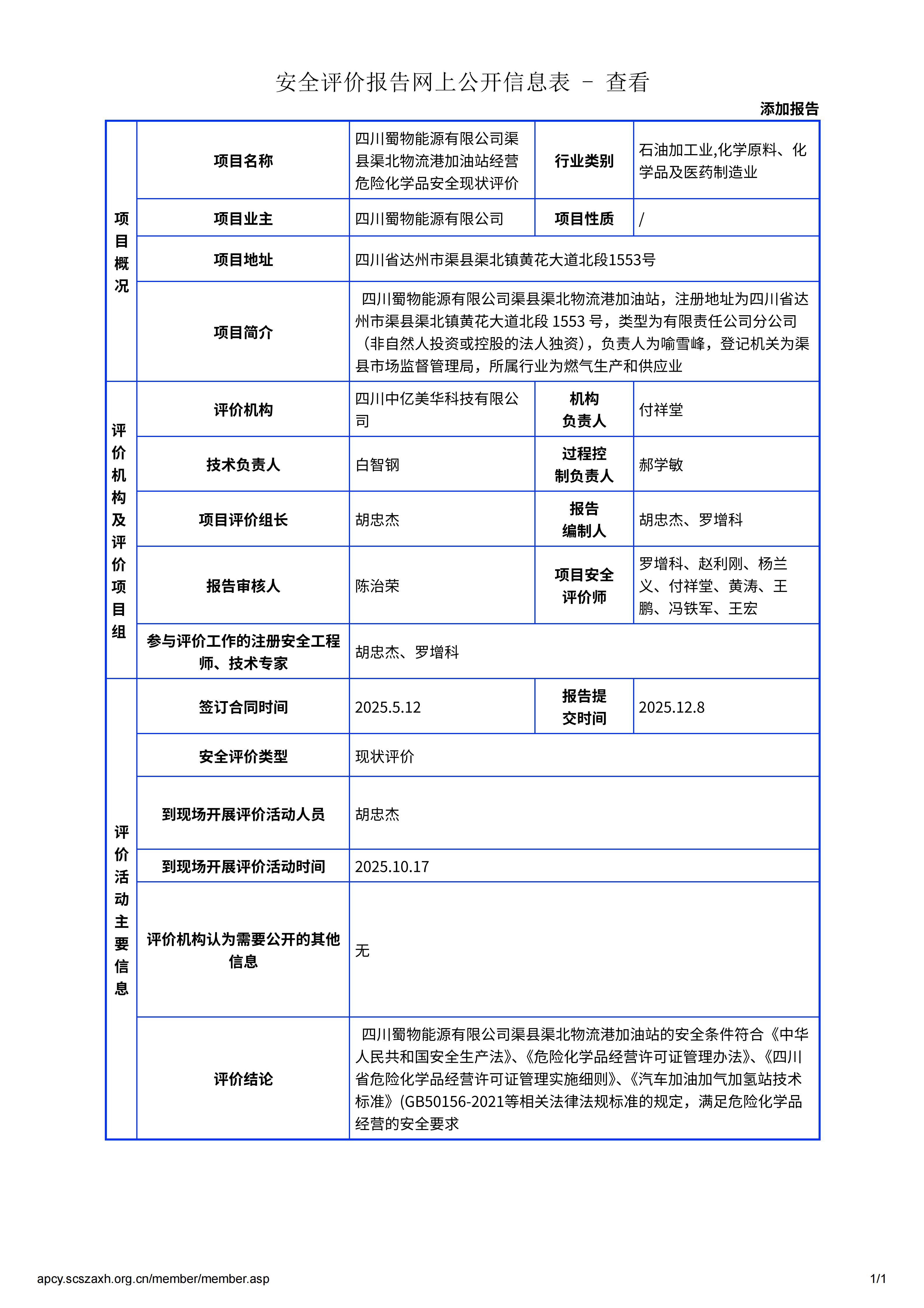 四川蜀物能源有限公司渠县渠北物流港加油站经营危险化学品安全现状评价