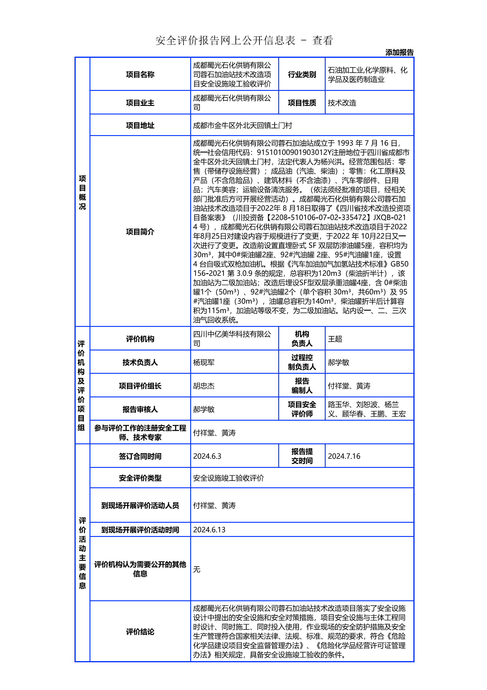 成都蜀光石化供销有限公 司蓉石加油站技术改造项 目安全设施竣工验收评价