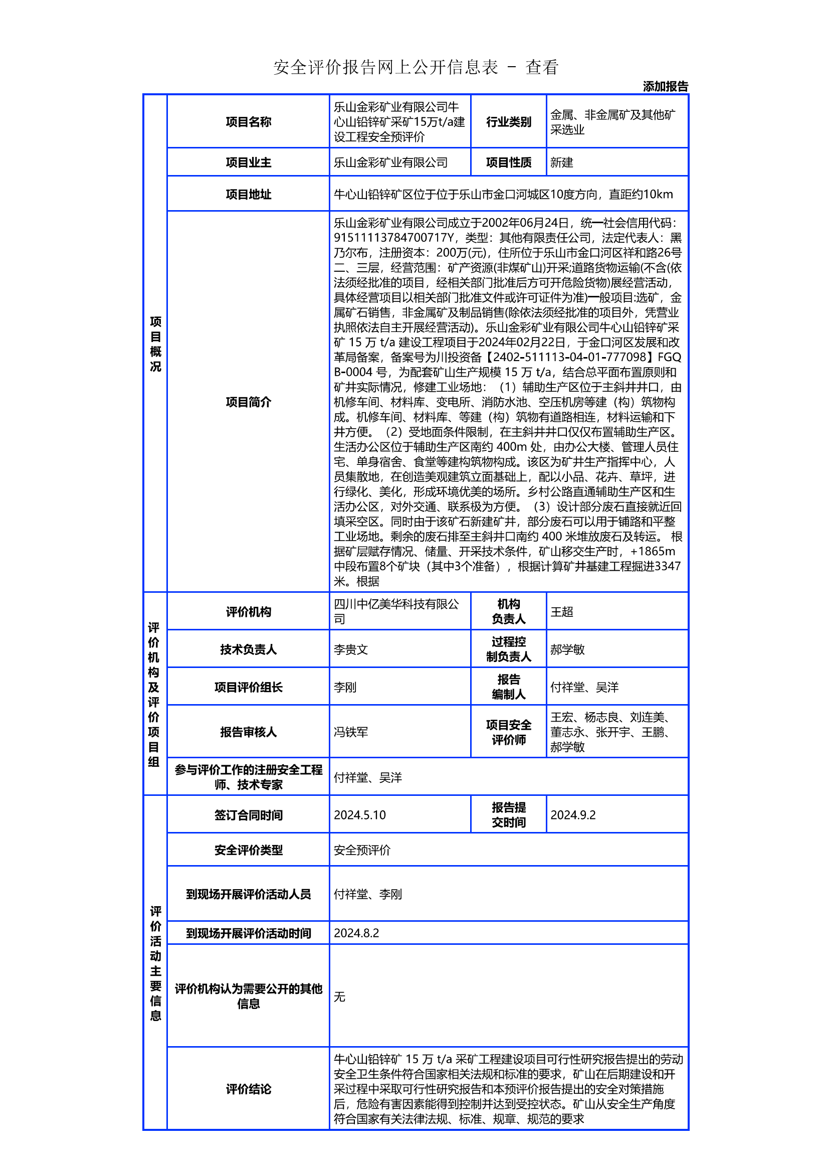 乐山金彩矿业有限公司牛心山铅锌矿采矿15万t/a建设工程安全预评价