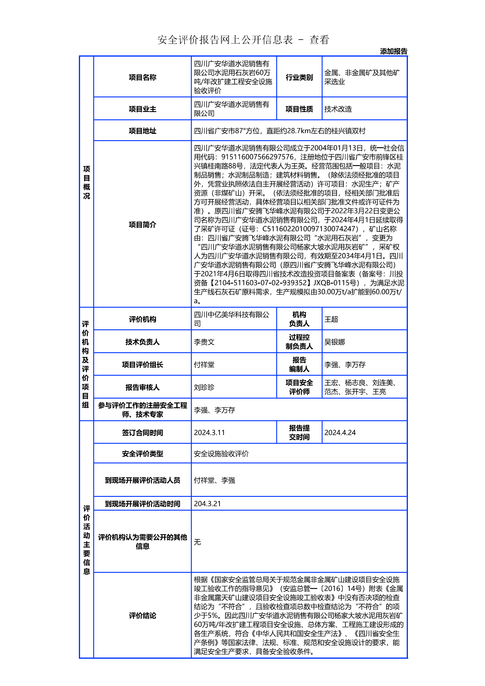 四川广安华道水泥销售有限公司水泥用石灰岩60万吨/年改扩建工程安全设施验收评价