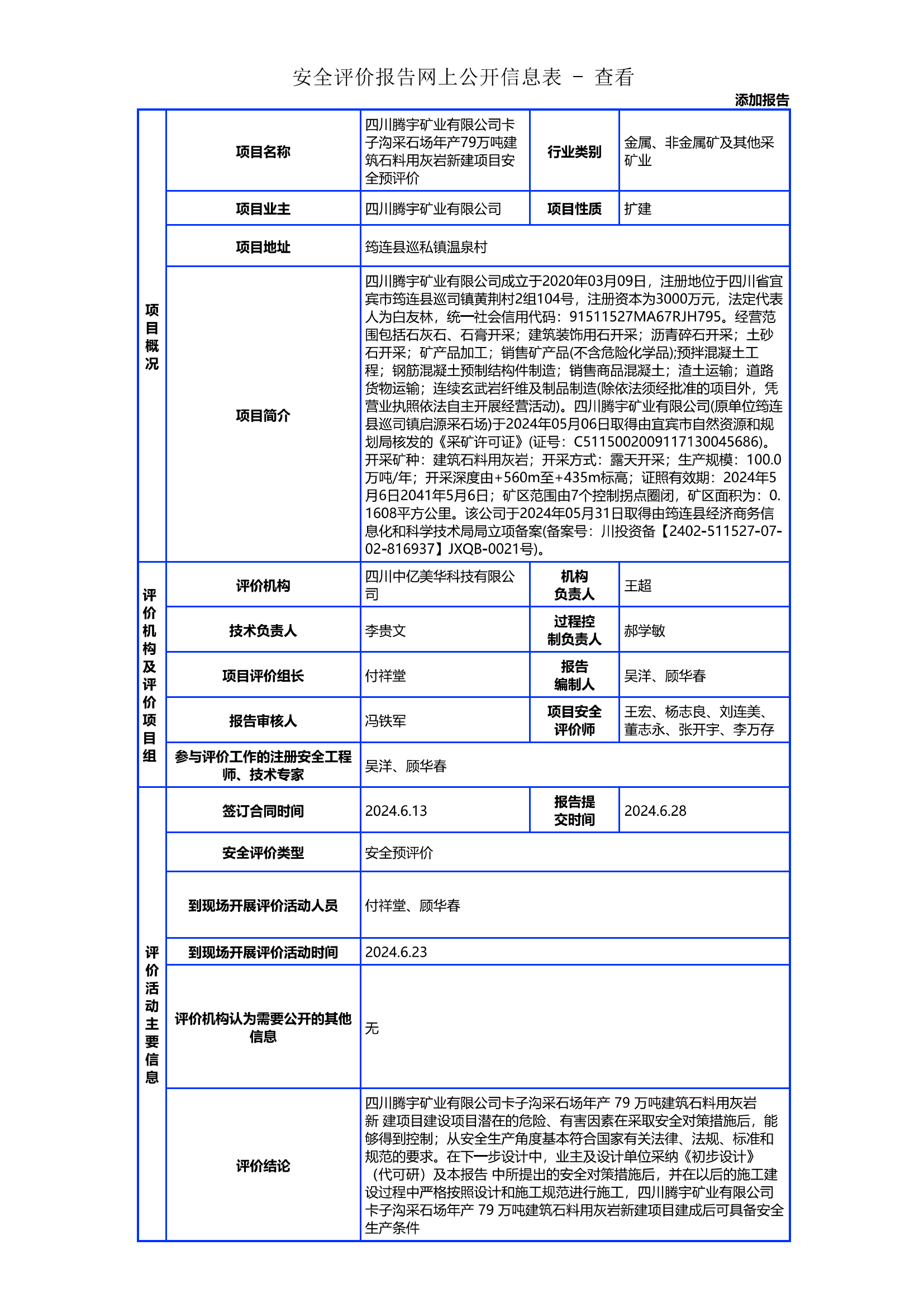 四川腾宇矿业有限公司卡子沟采石场年产79万吨建筑石料用灰岩新建项目安全预评价