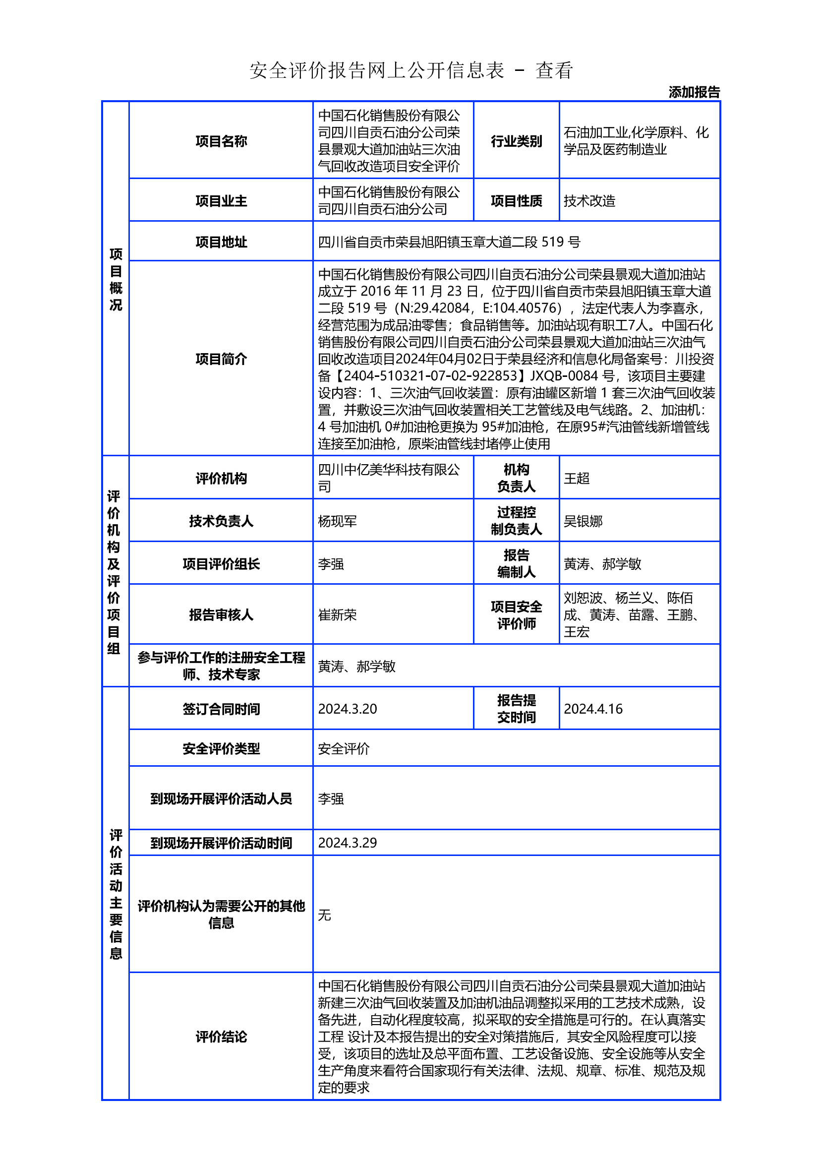 中国石化销售股份有限公司四川自贡石油分公司荣县景观大道加油站三次油气回收改造项目安全评价