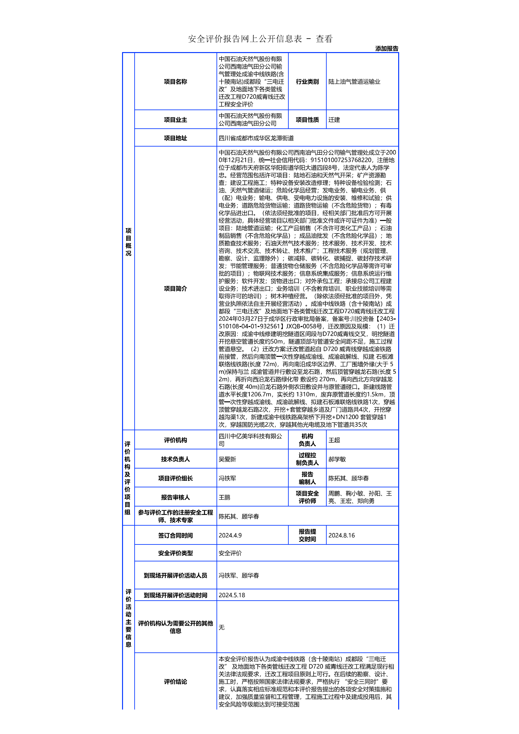 中国石油天然气股份有限公司西南油气田分公司输气管理处成渝中线铁路(含十陵南站)成都段“三电迁改”及地面地下各类管线迁改工程D720威青线迁改工程安全评价
