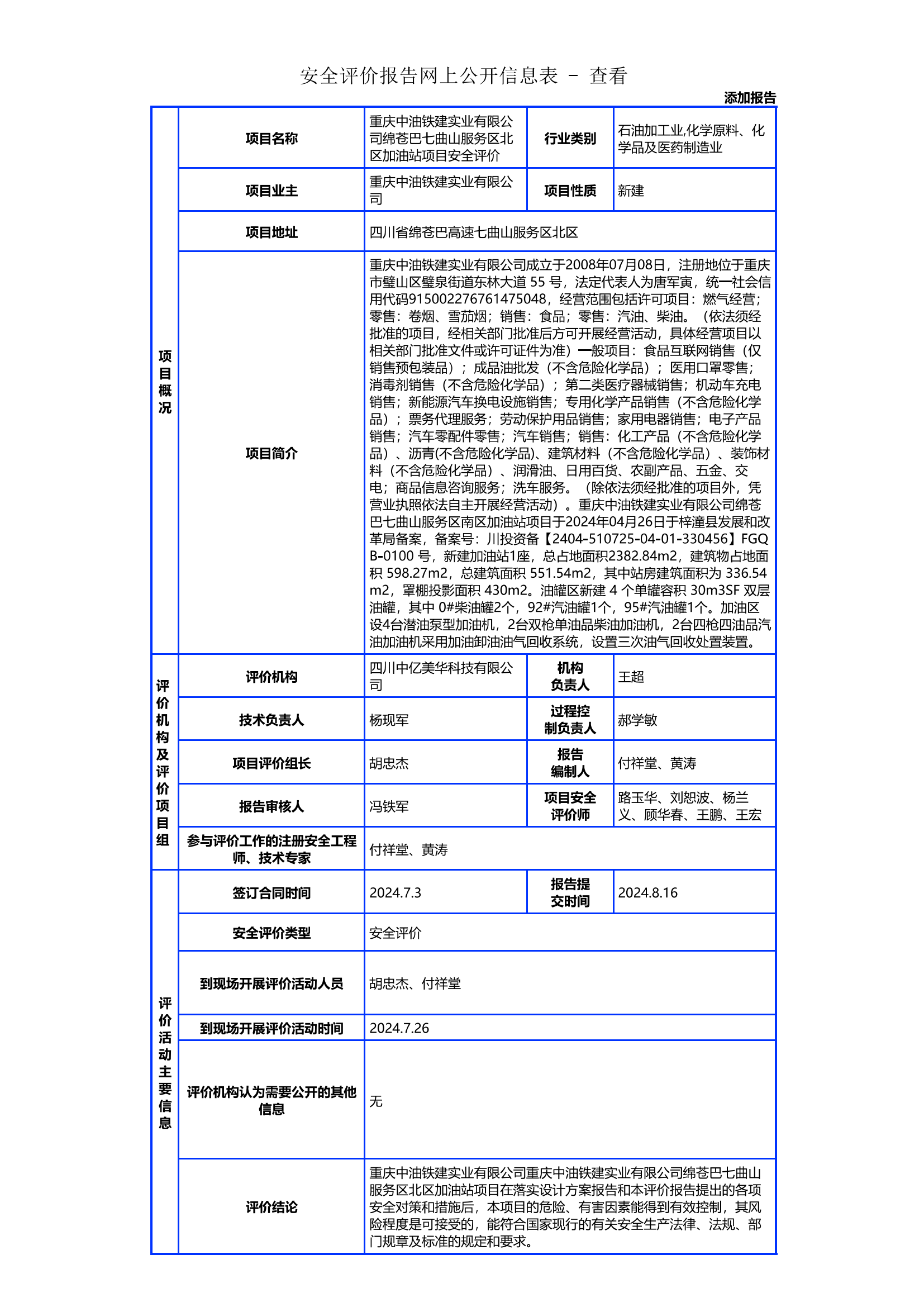 重庆中油铁建实业有限公司绵苍巴七曲山服务区南区加油站项目安全评价