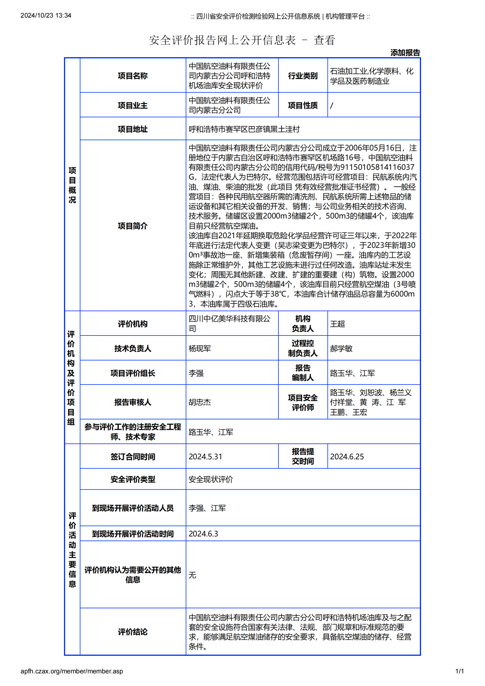 中国航空油料有限责任公 司内蒙古分公司呼和浩特 机场油库安全现状评价