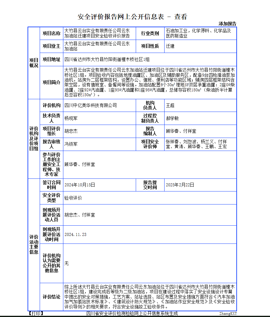 大竹县云台实业有限责任公司云东加油站迁建项目安全验收评价报告
