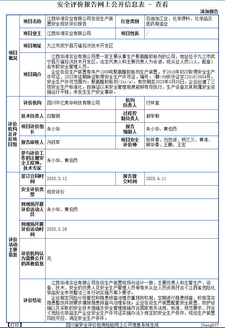 江西华港实业有限公司在役生产装置安全现状评价报告