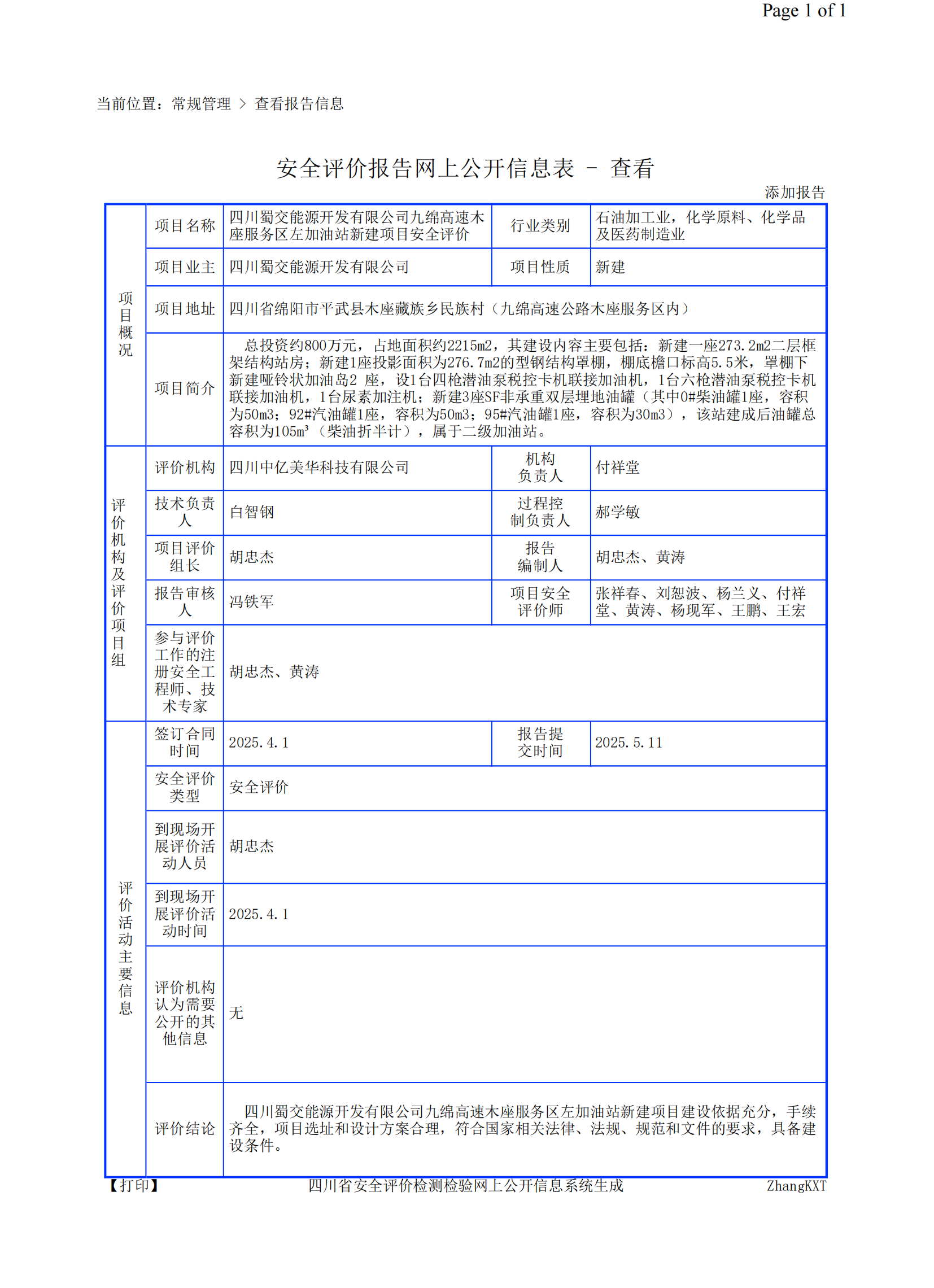 四川蜀交能源开发有限公司九绵高速木座服务区右加油站新建项目安全评价