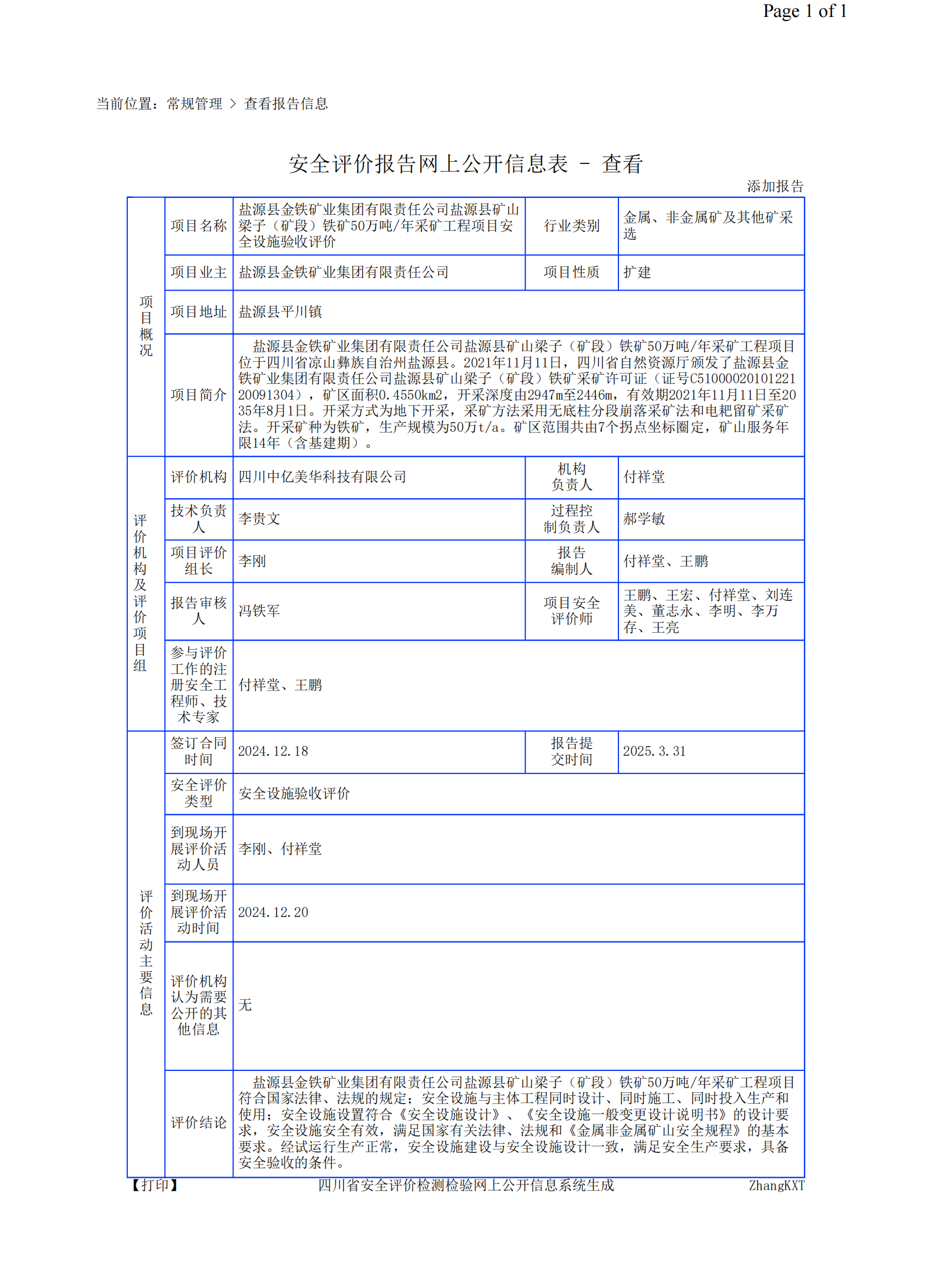 盐源县金铁矿业集团有限责任公司盐源县矿山梁子(矿段)铁矿50万吨/年采矿工程项目安全设施验收评价