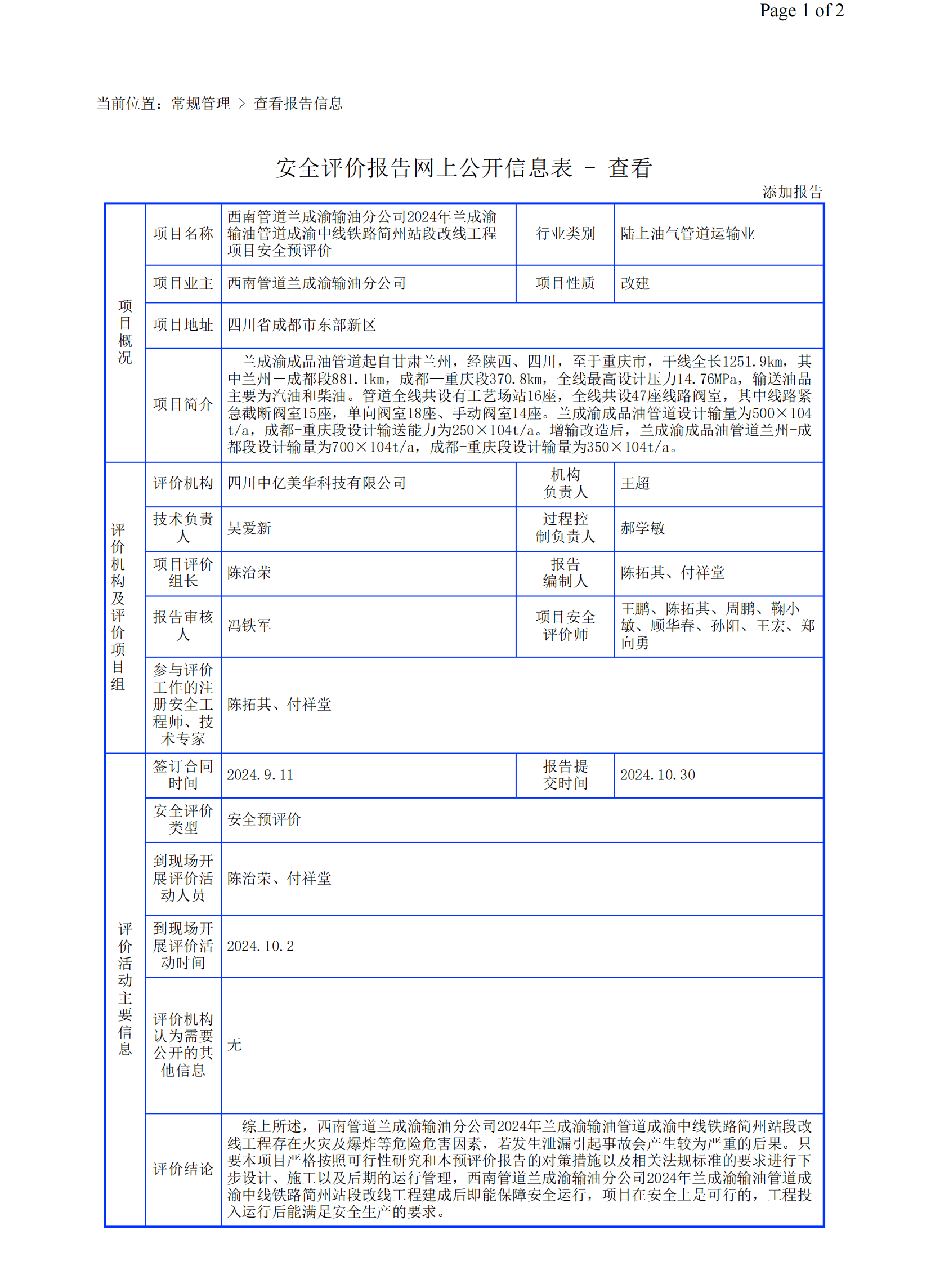 西南管道兰成渝输油分公司2024年兰成渝输油管道成渝中线铁路简州站段改线工程项目安全预评价