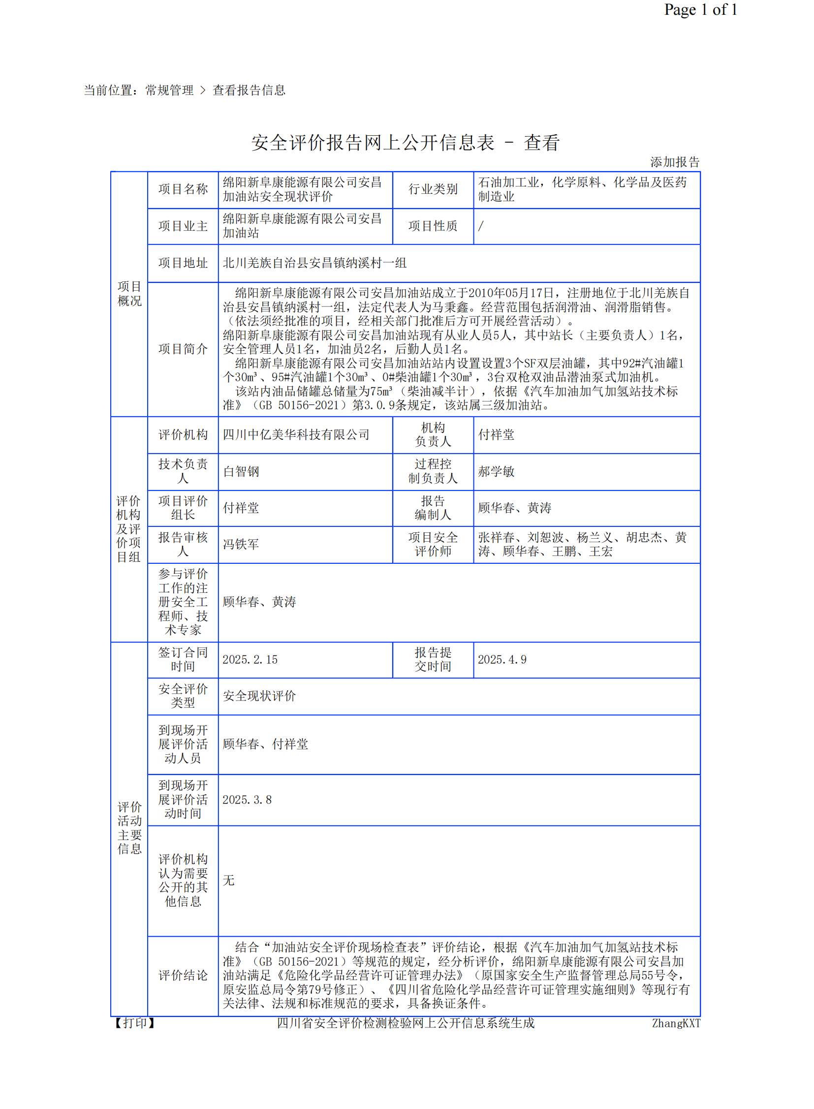 绵阳新阜康能源有限公司安昌加油站安全现状评价