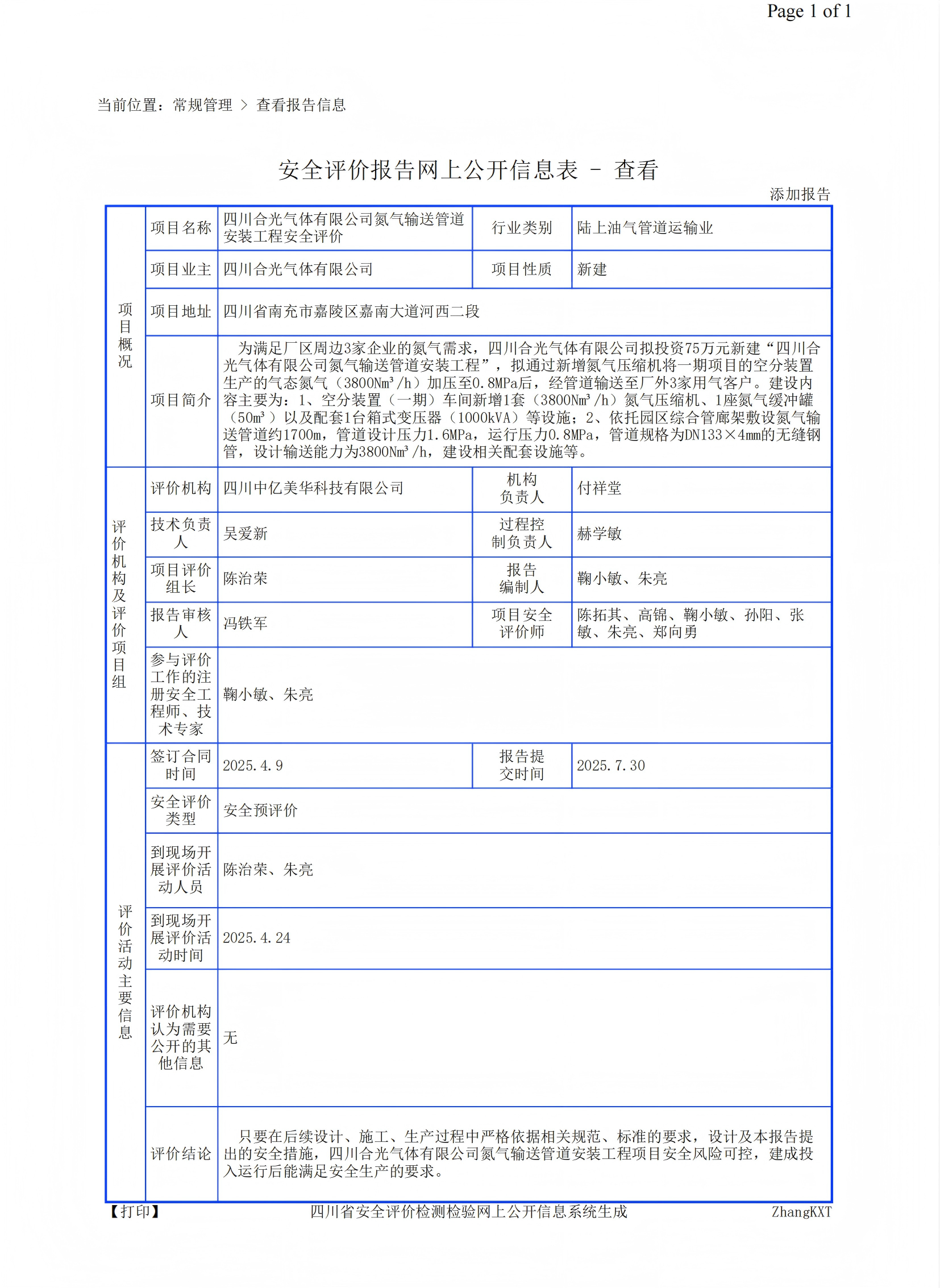 四川合光气体有限公司氮气输送管道安装工程安全评价