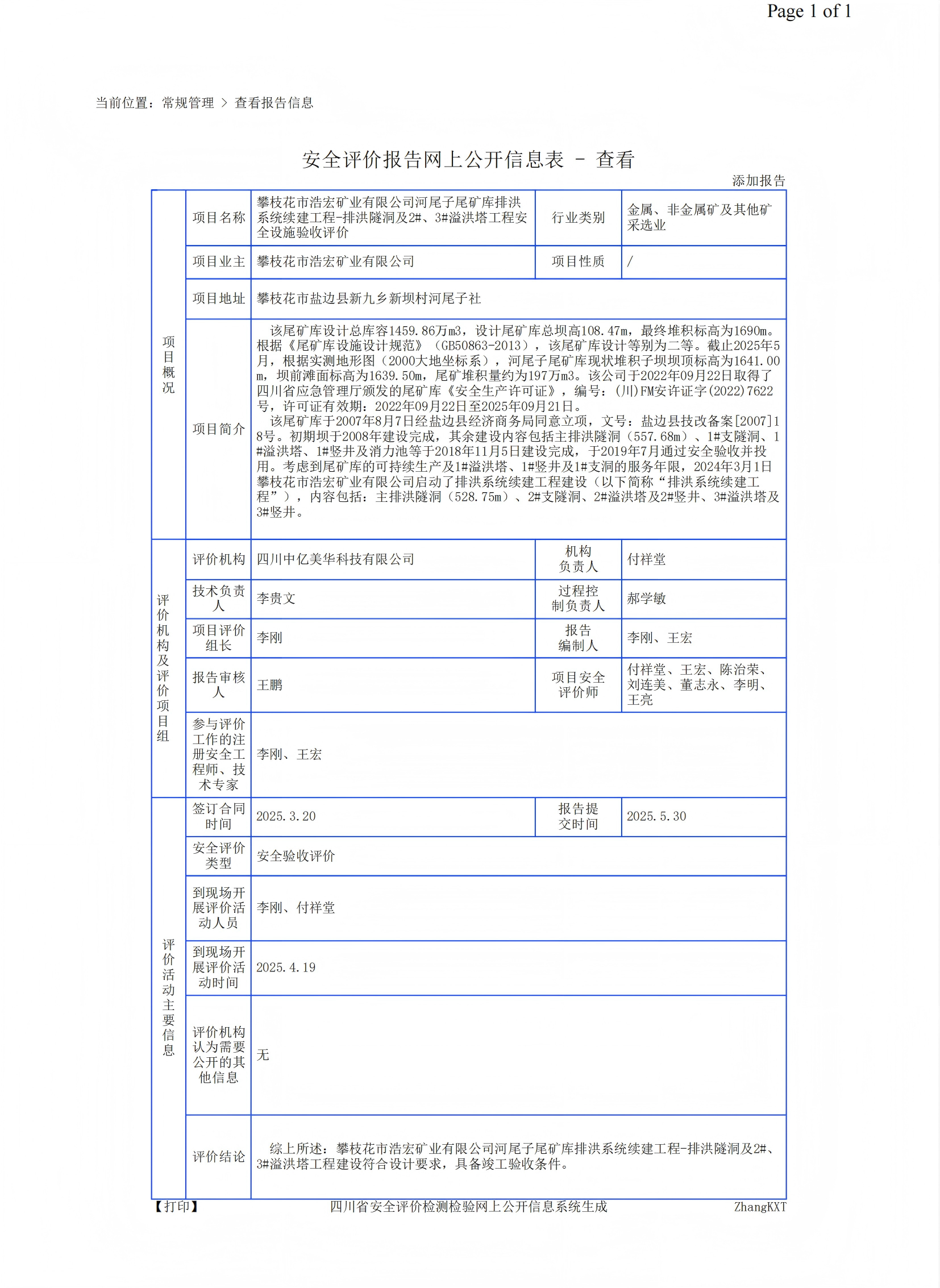 攀枝花市浩宏矿业有限公司河尾子尾矿库排洪系统续建工程-排洪隧洞及2#、3#溢洪塔工程安全设施验收评价