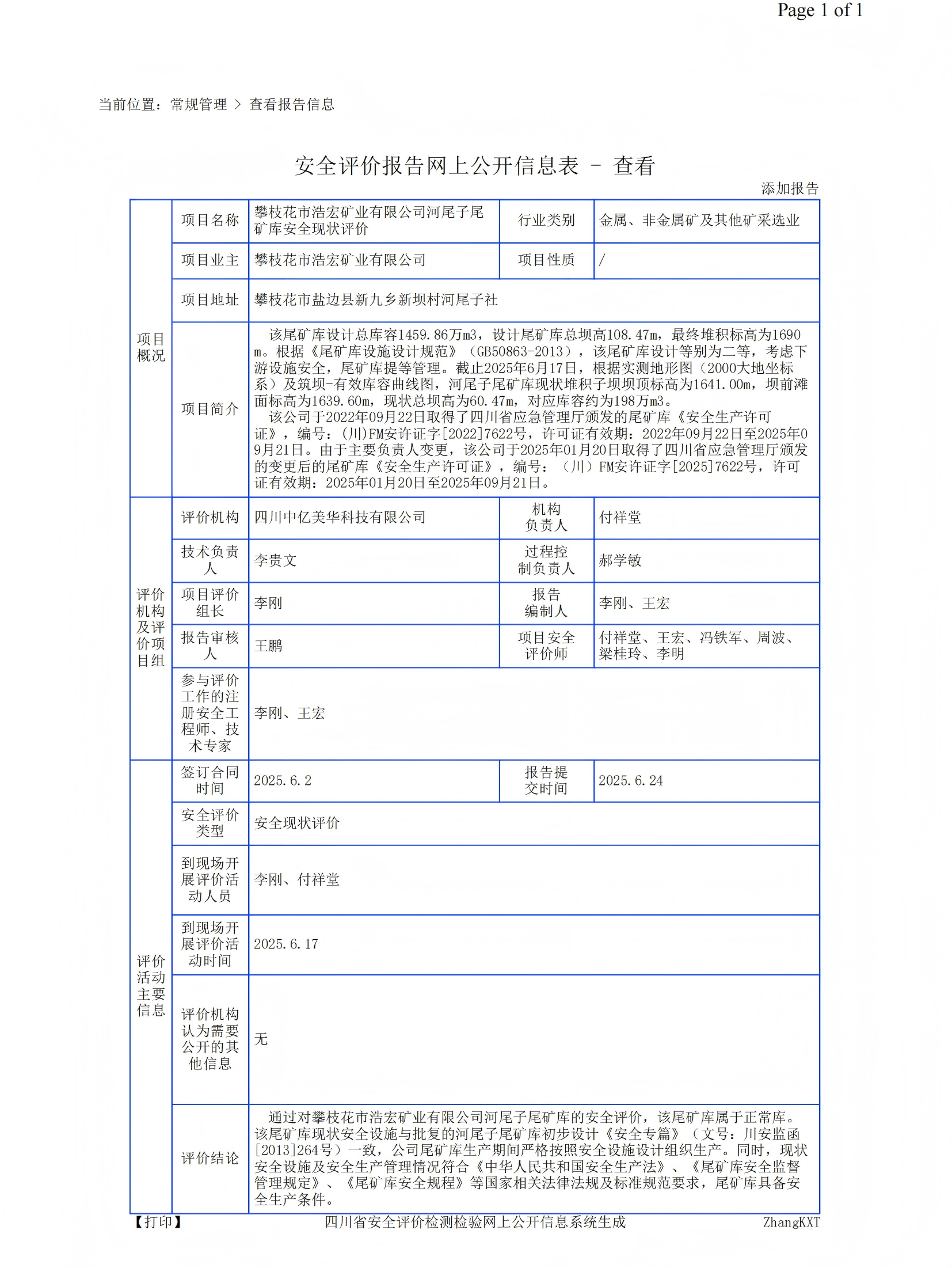 攀枝花市浩宏矿业有限公司河尾子尾矿库安全现状评价