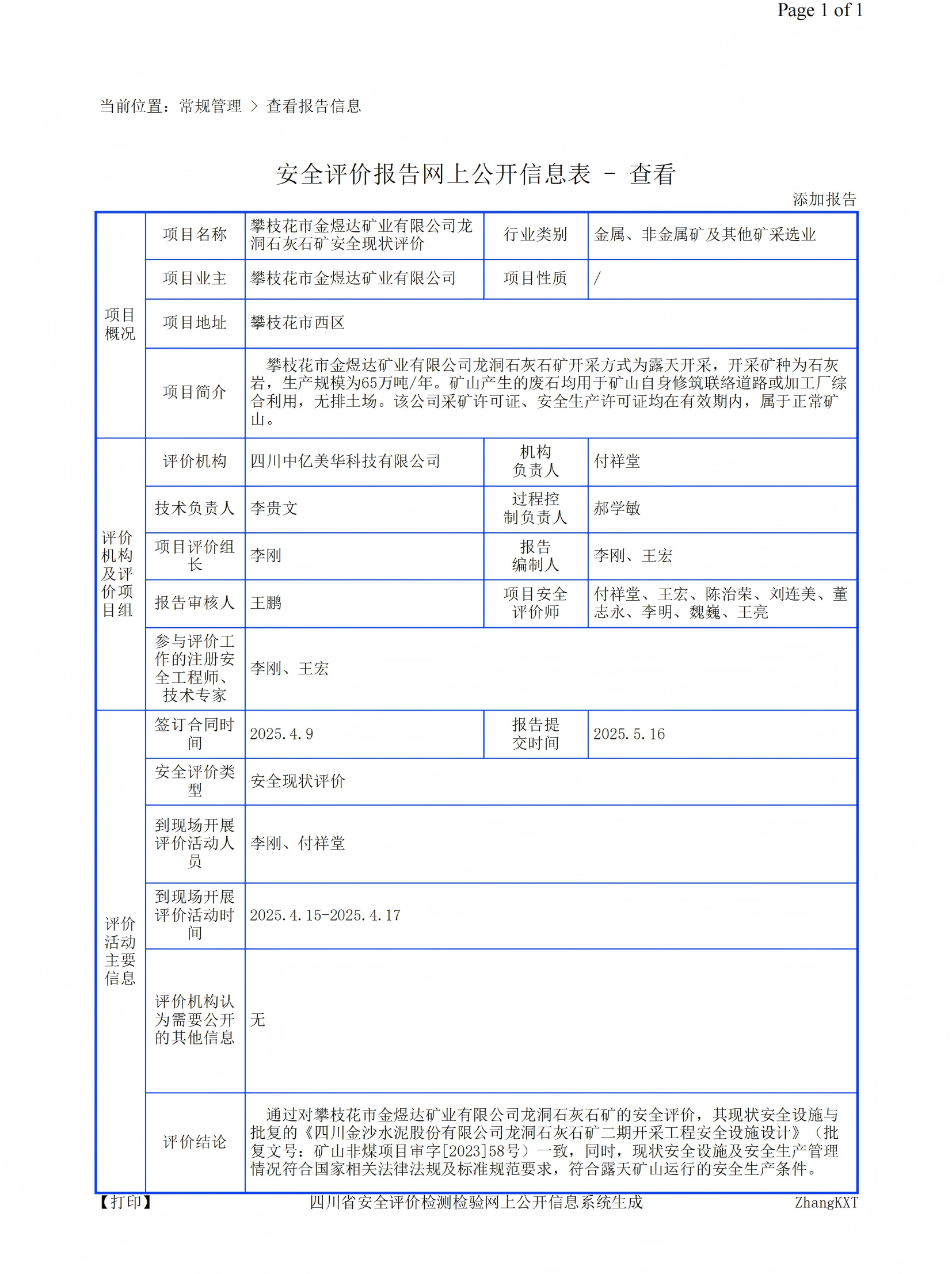 攀枝花市金煜达矿业有限公司龙洞石灰石矿安全现状评价