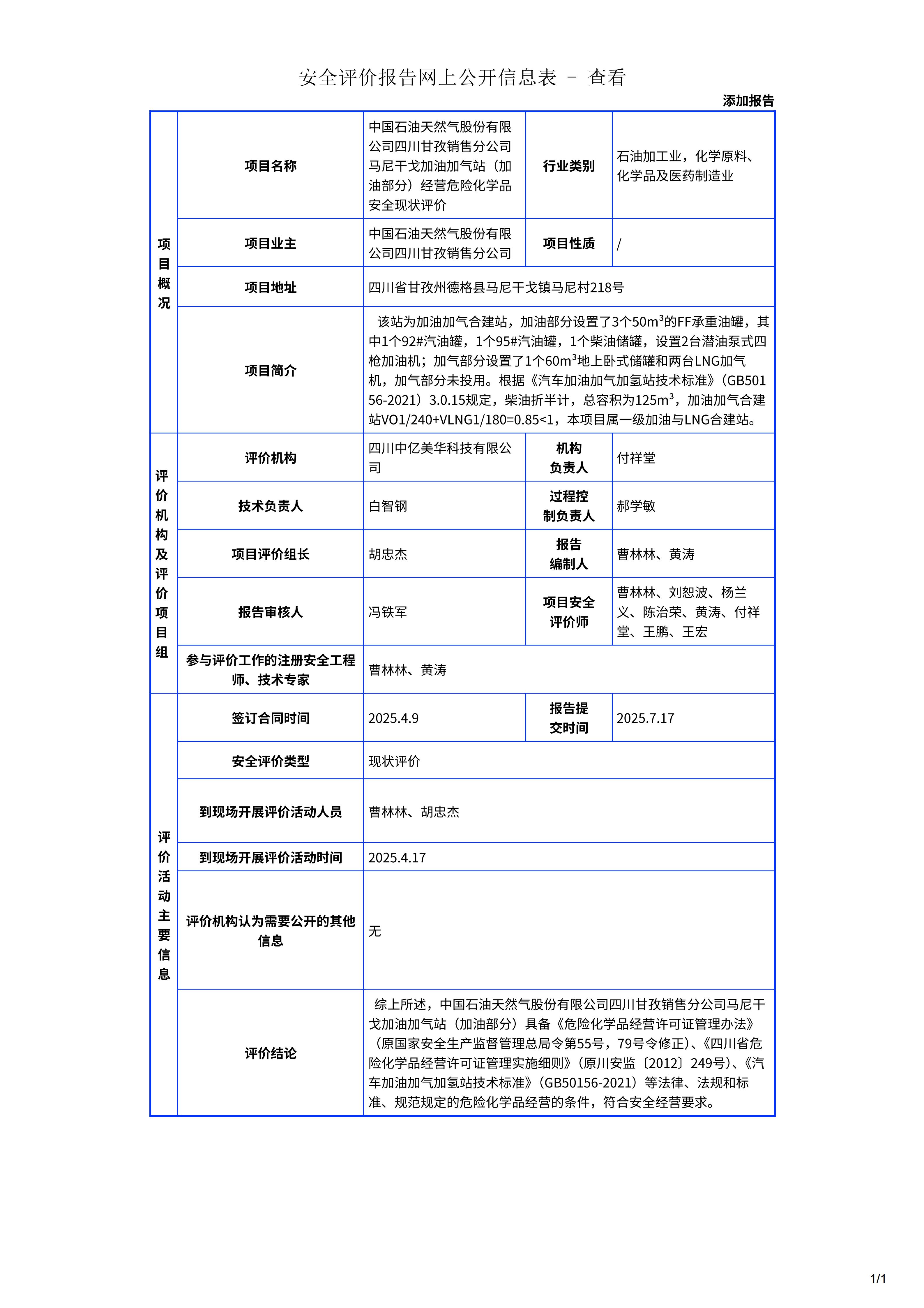中国石油天然气股份有限公司四川甘孜销售分公司马尼干戈加油加气站(加油部分)经营危险化学品安全现状评价
