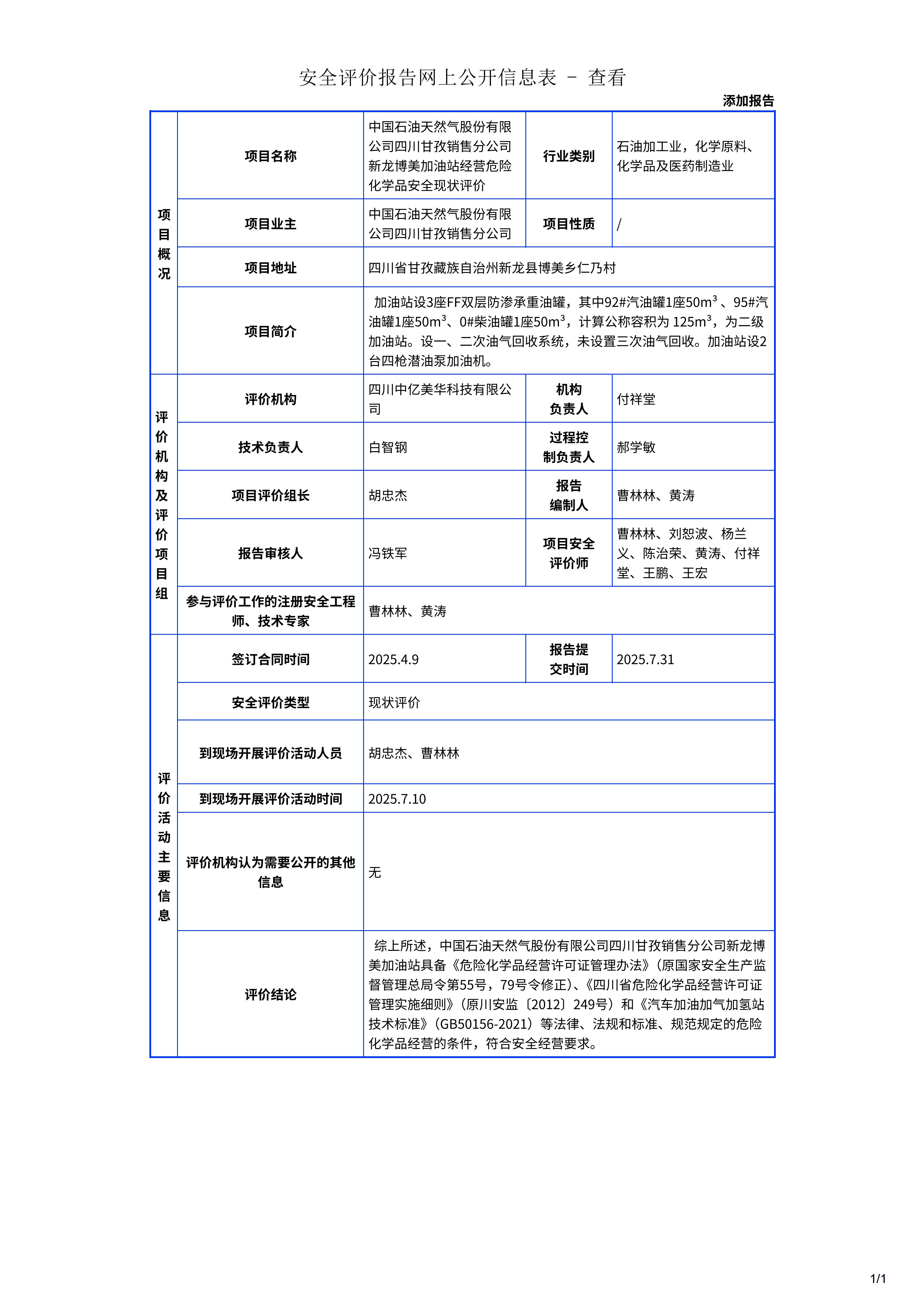 中国石油天然气股份有限公司四川甘孜销售分公司新龙博美加油站经营危险化学品安全现状评价