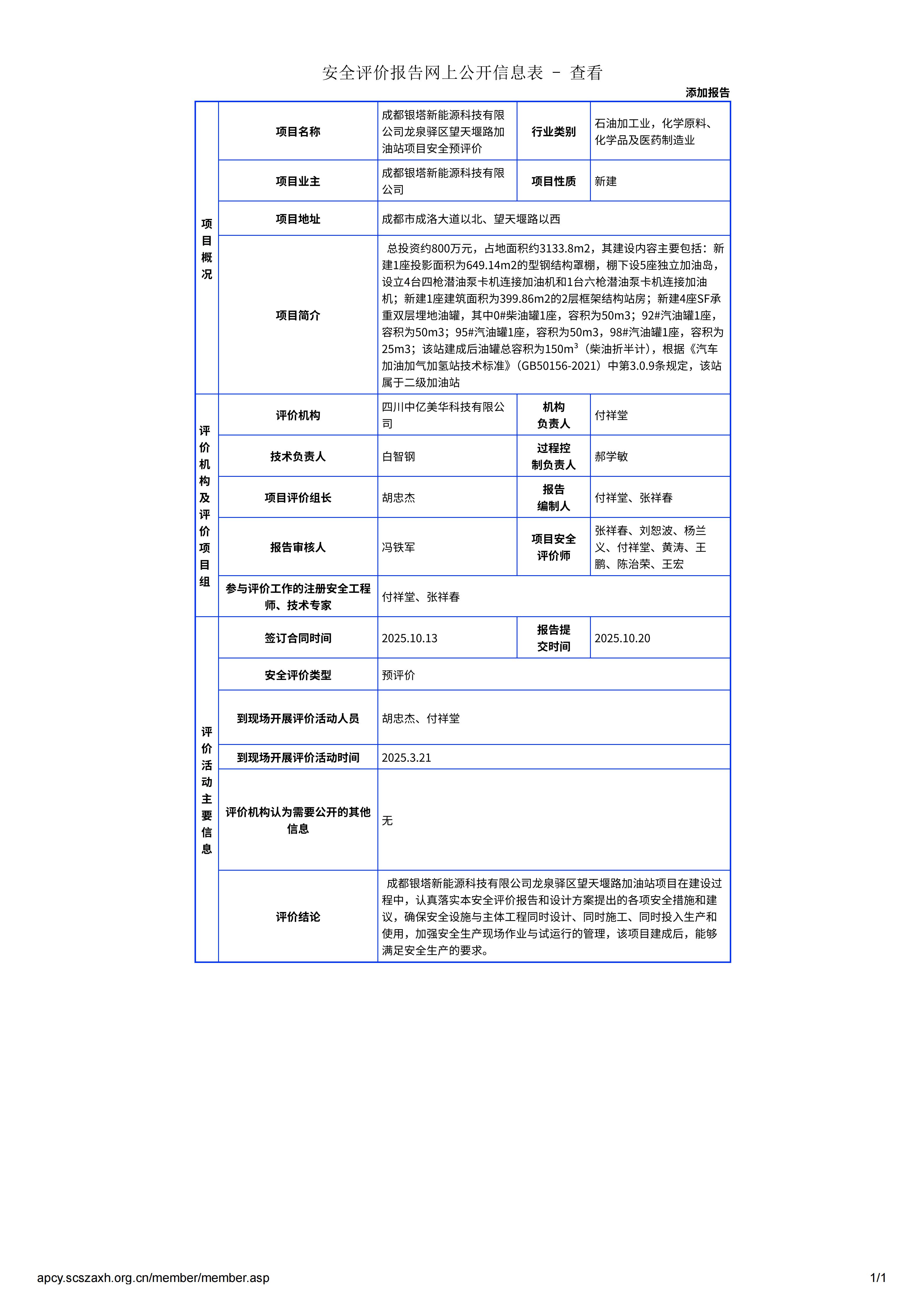 成都银塔新能源科技有限公司龙泉驿区望天堰路加油站项目安全预评价