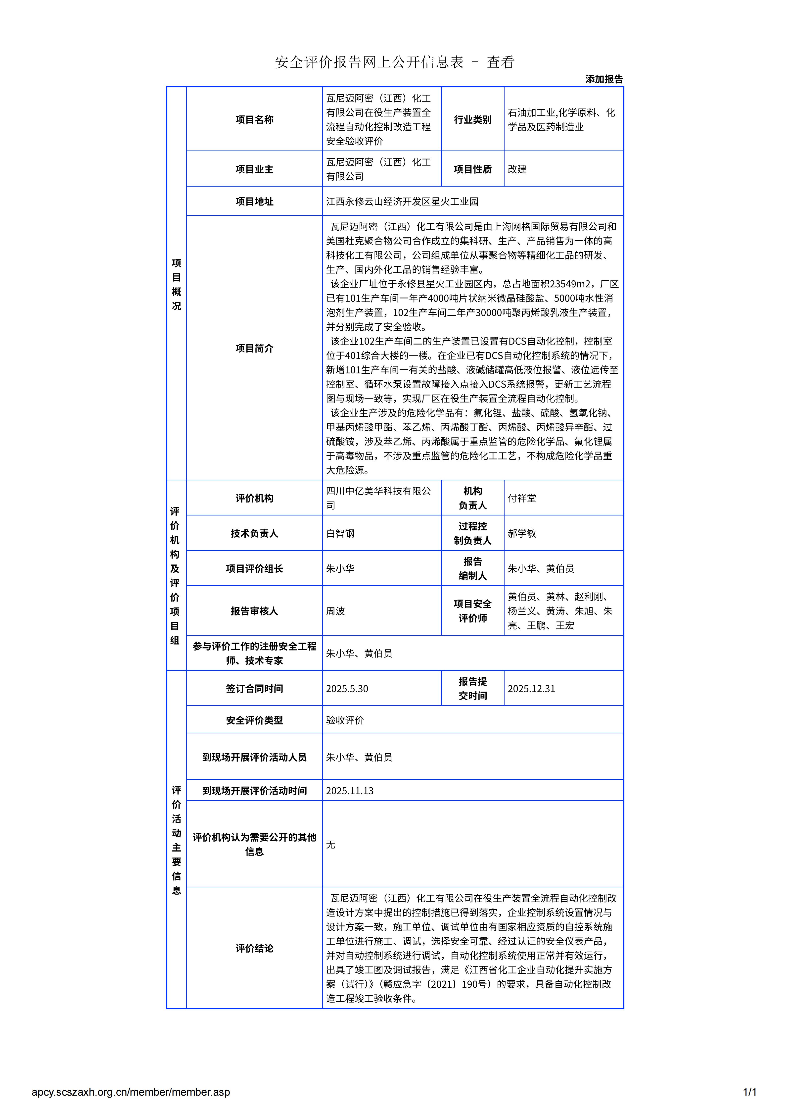瓦尼迈阿密(江西)化工有限公司在役生产装置全流程自动化控制改造工程安全验收评价
