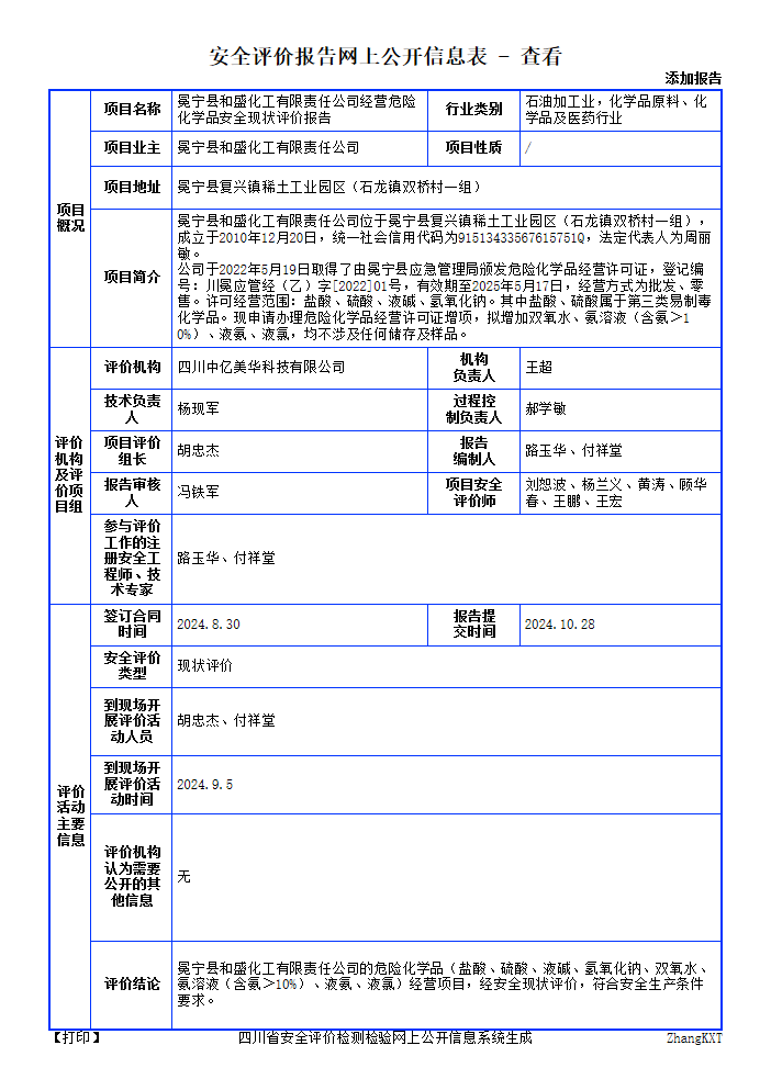 冕宁县和盛化工有限责任公司经营危险化学品安全现状评价报告