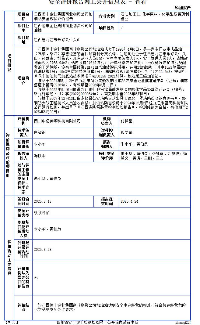 江西恒丰企业集团商业物资公司加油站安全现状评价报告