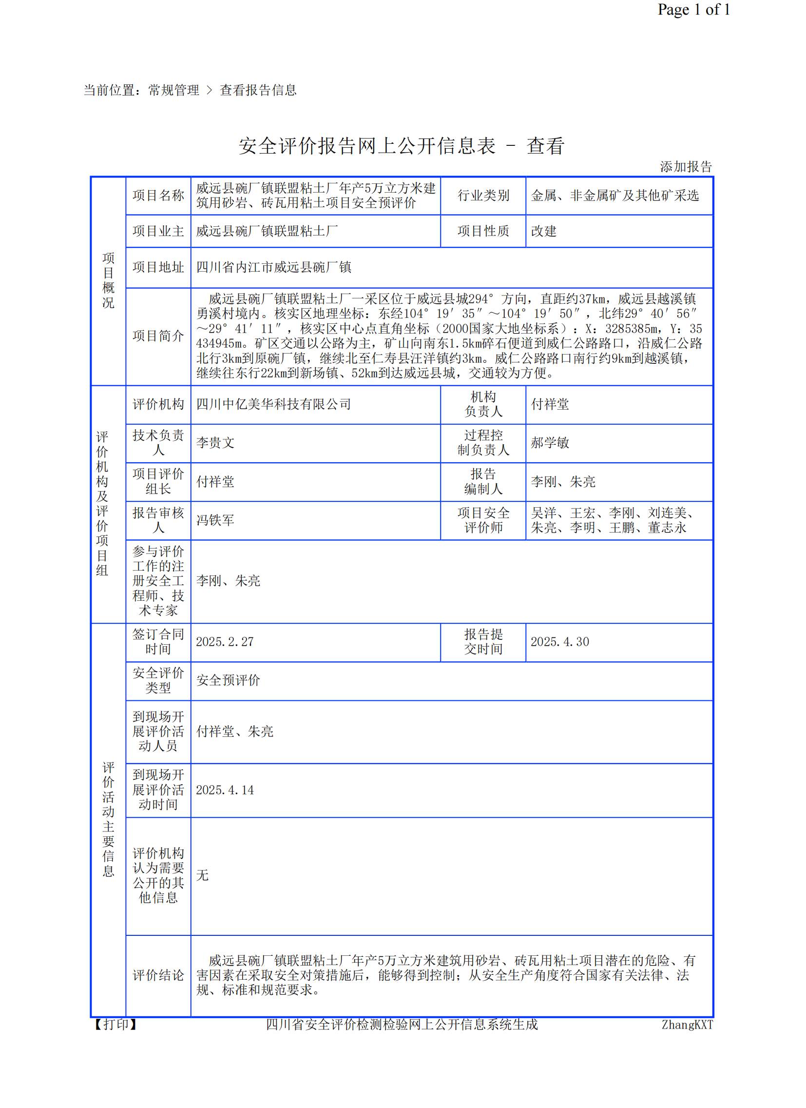 威远县碗厂镇联盟粘土厂年产5万立方米建筑用砂岩、砖瓦用粘土项目安全预评价