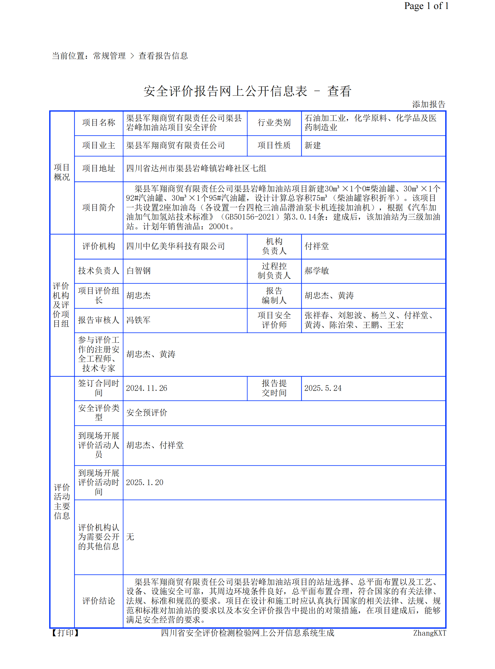 渠县军翔商贸有限责任公司渠县岩峰加油站项目安全评价