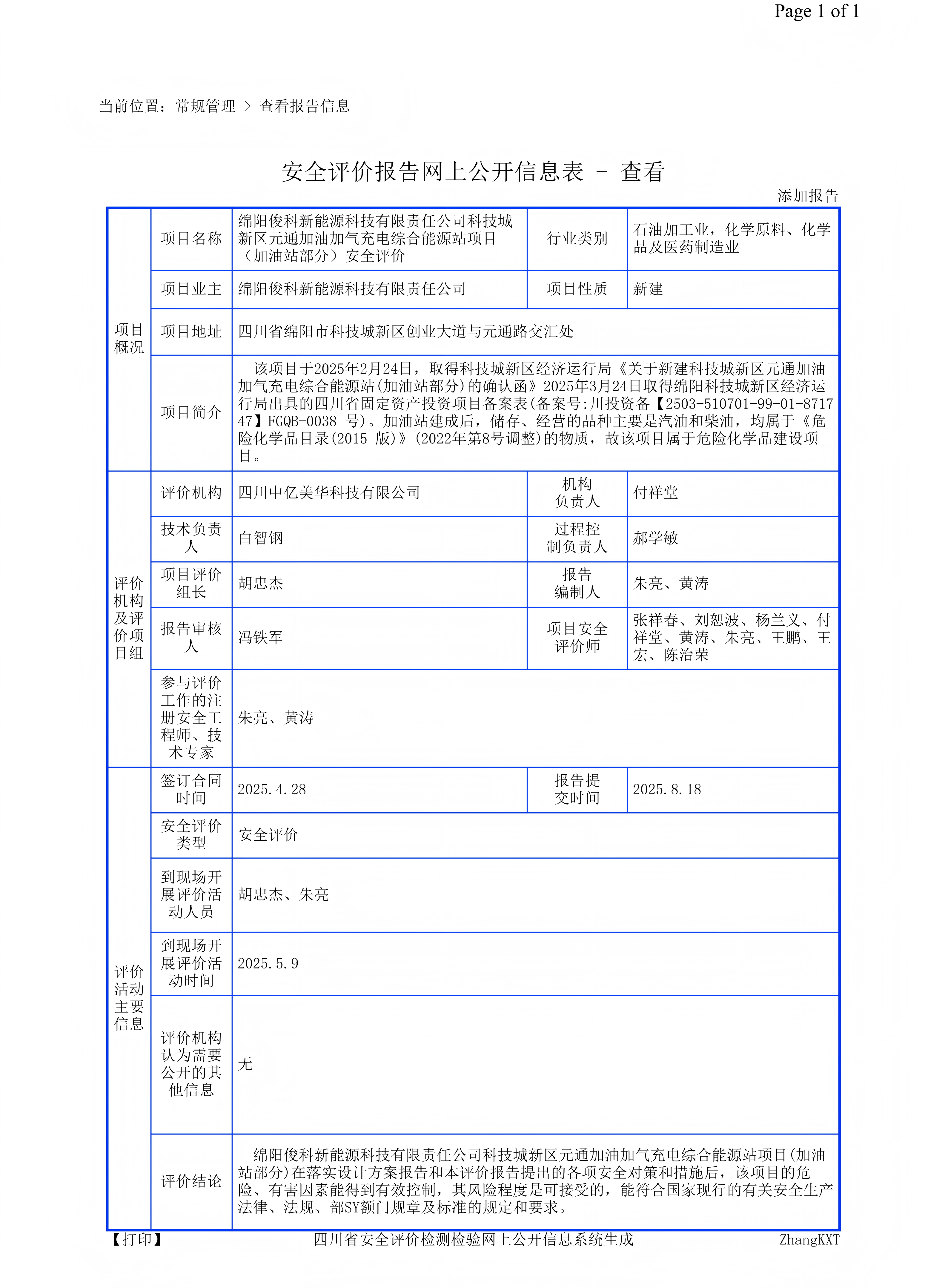 绵阳俊科新能源科技有限责任公司科技城新区元通加油加气充电综合能源站项目(加油站部分)安全评价